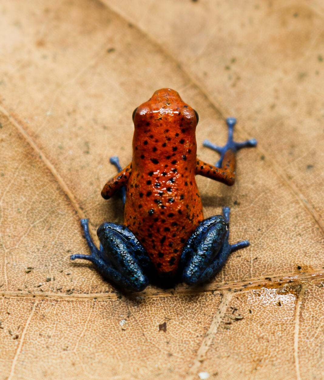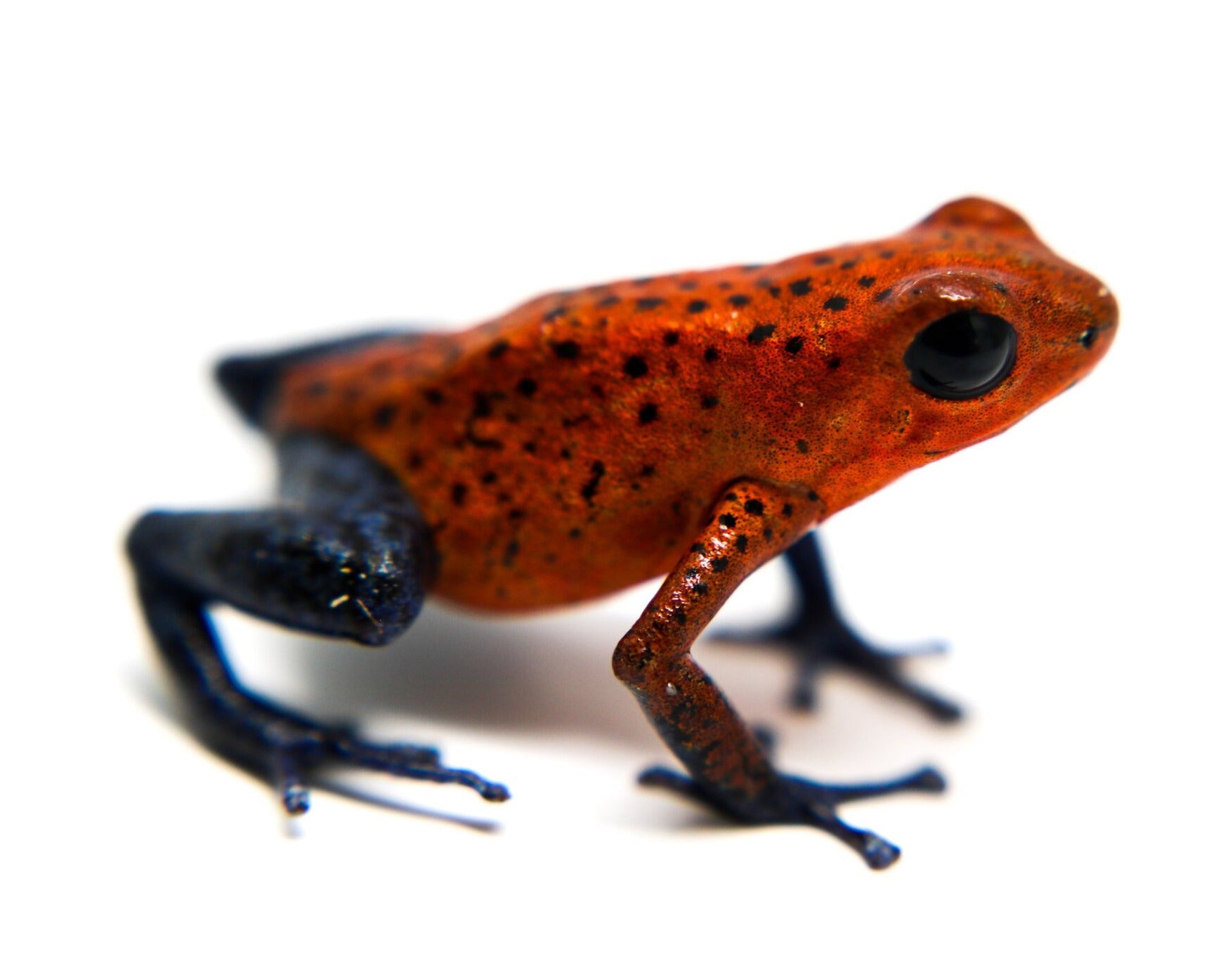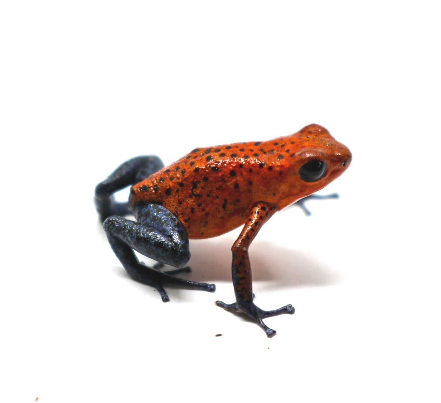 Oophaga pumilio "Aldana" is a small poison dart frog that inhabits Panama. They have boldly colored red bodies with blue colored legs...much like Isla Cristobal. They do fine in small groups, but do best as a pair or trio when sexual maturity is reached. The males often have control of 1 to 5 square meters of territory in the wild, so rival males may display aggression for supremacy. They usually lay 3 to 10 eggs on glossy leaves, on glass, or sometimes in leaf litter. Tadpoles must be raised by adults because they feed on infertile eggs from the female. These dart frogs are interesting to many hobbyists because they exhibit biparental care. No more than a trio should go in a 20 gallon vertical conversion tank or a 18 x 24 Exo-terra enclosure. Additional information can be found, of course, through our complimentary Encyclopedia Database: DendroKnow Project.