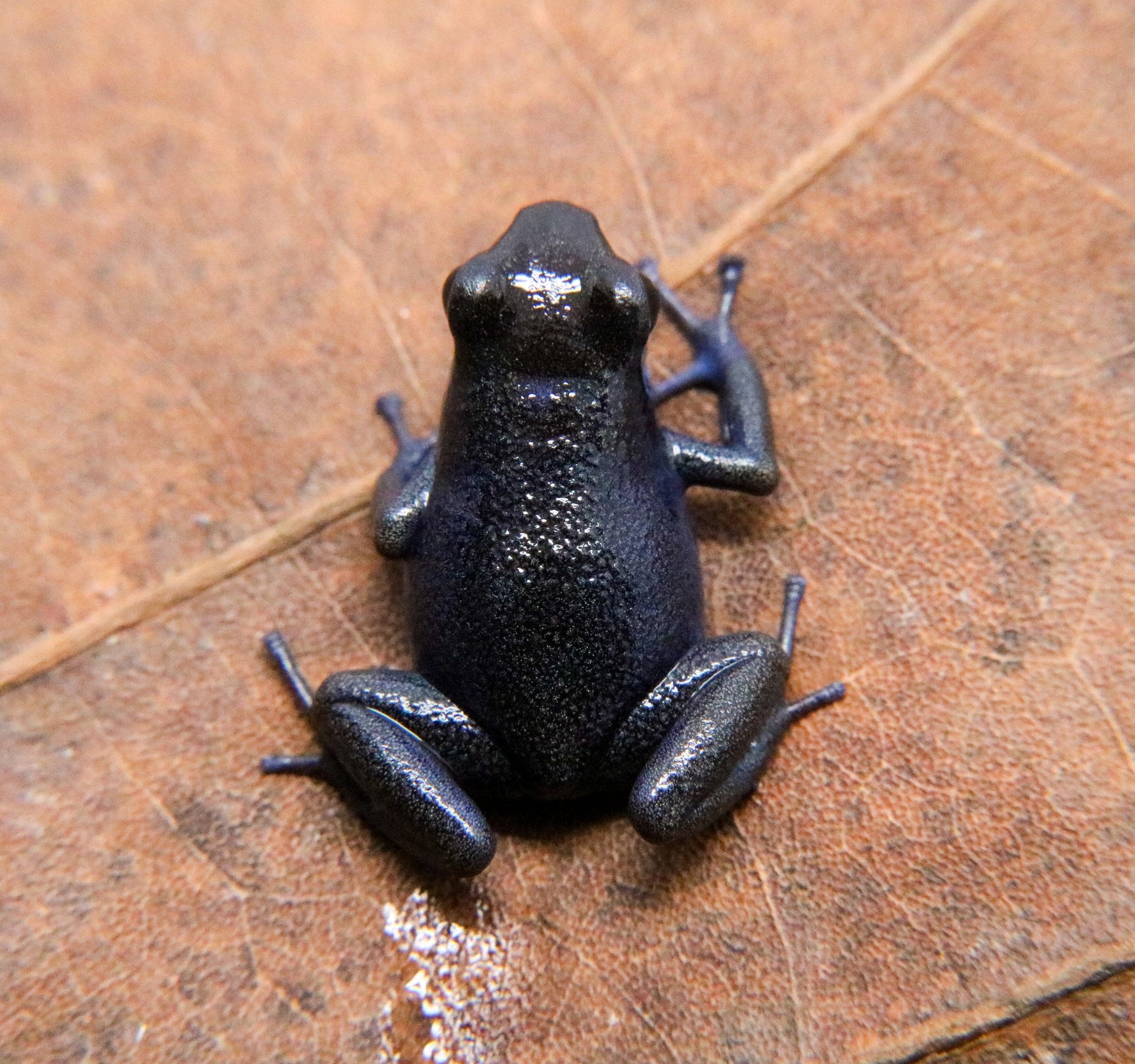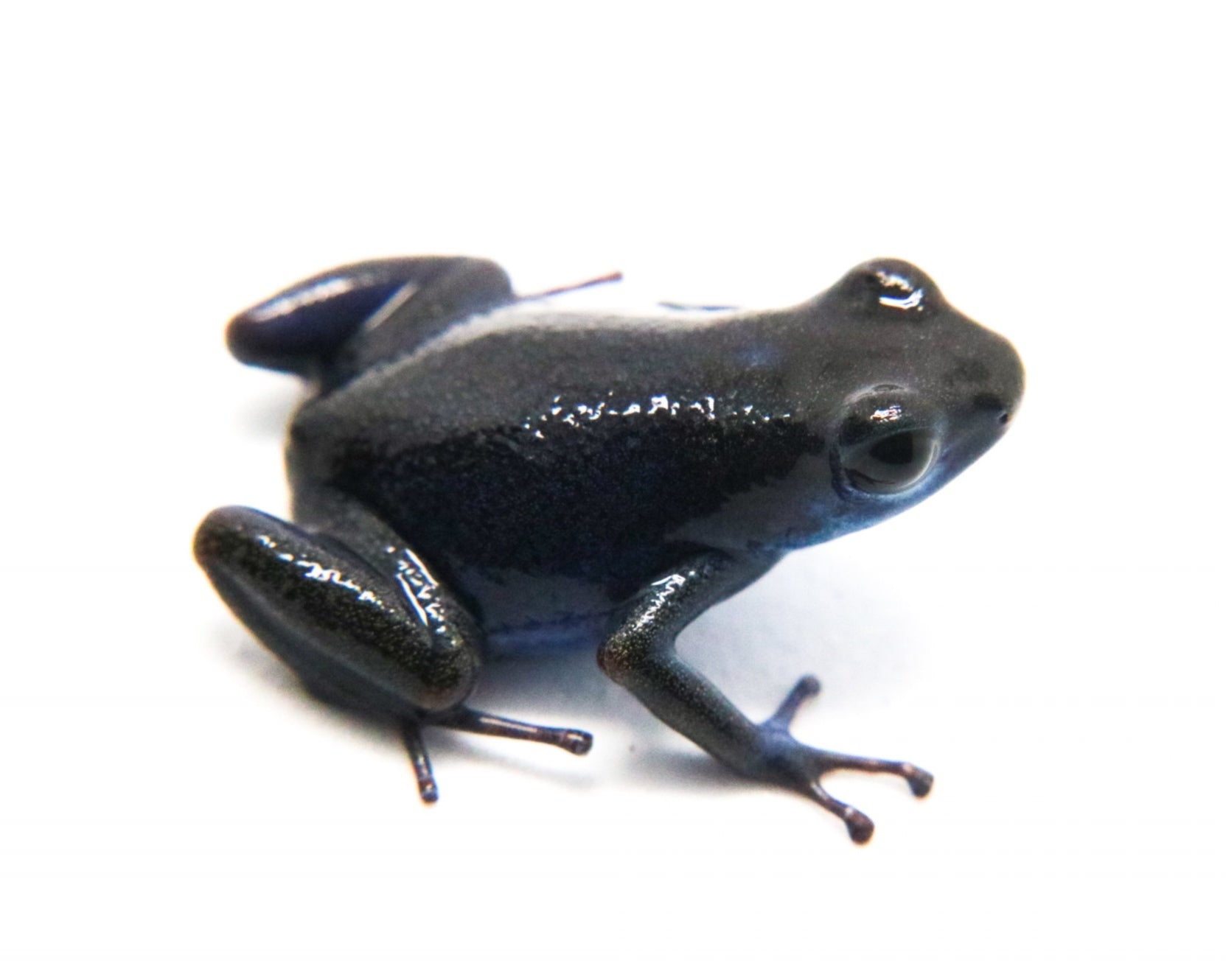 Oophaga pumilio "Cauchero" locale is restricted to the Cauchero corregimiento in the Bocas del Torro providence, Panama. Their dorsal coloration is usually dark blue with ventral coloration being a lighter blue / white. They do fine in small groups, but do best as a pair or trio when sexual maturity is reached. The males often have control of 1 to 5 square meters of territory in the wild, so rival males may display aggression for supremacy. They usually lay 3 to 10 eggs on glossy leaves, on glass, or sometimes in leaf litter. Tadpoles must be raised by adults because they feed on infertile eggs from the female. These dart frogs are interesting to many hobbyists because they exhibit biparental care. No more than a trio should go in a 20 gallon vertical conversion tank or a 18 x 24 Exo-terra enclosure. Additional information can be found, of course, through our complimentary Encyclopedia Database: DendroKnow Project.
