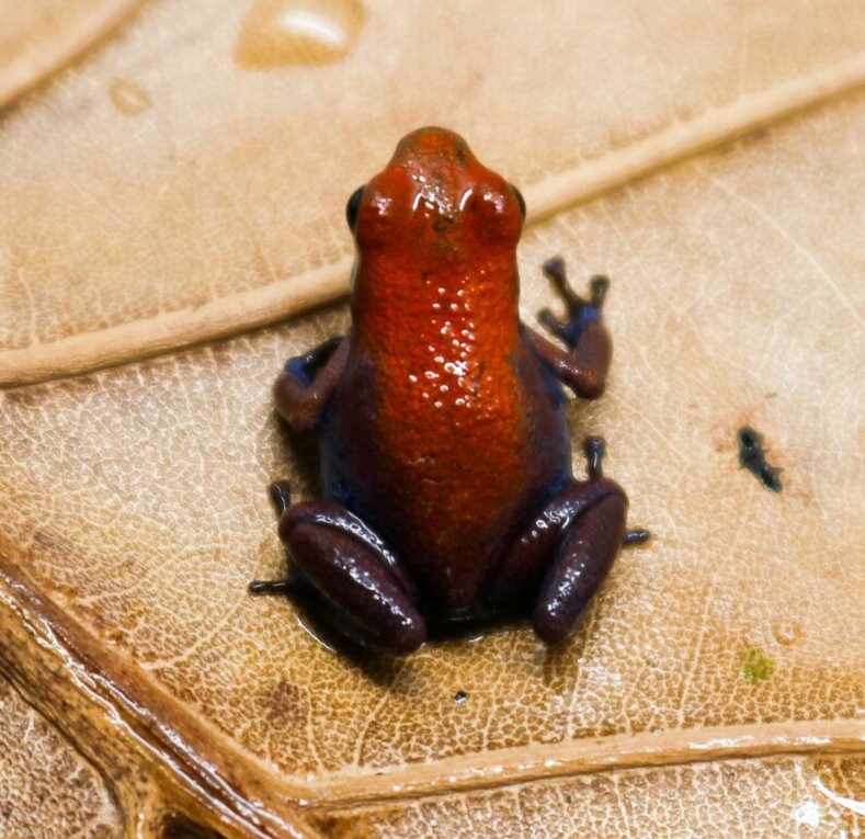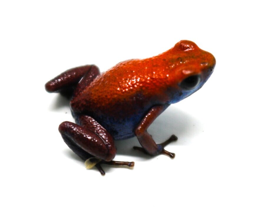 Oophaga pumilio "Escudo"" is a very small poison dart frog that inhabits Escudo in Panama. They have dark blue to purple to red coloration and are somewhat variable, having mostly splotches of red on the dorsal and blue on the ventral, although this varies. They do fine in small groups, but do best as a pair or trio when sexual maturity is reached. The males often have control of 1 to 5 square meters of territory in the wild, so rival males may display aggression for supremacy. They usually lay 3 to 10 eggs on glossy leaves, on glass, or sometimes in leaf litter. Tadpoles must be raised by adults because they feed on infertile eggs from the female. These dart frogs are interesting to many hobbyists because they exhibit biparental care. No more than a trio should go in a 20 gallon vertical conversion tank or a 18 x 24 Exo-terra enclosure. Additional information can be found, of course, through our complimentary Encyclopedia Database: DendroKnow Project.