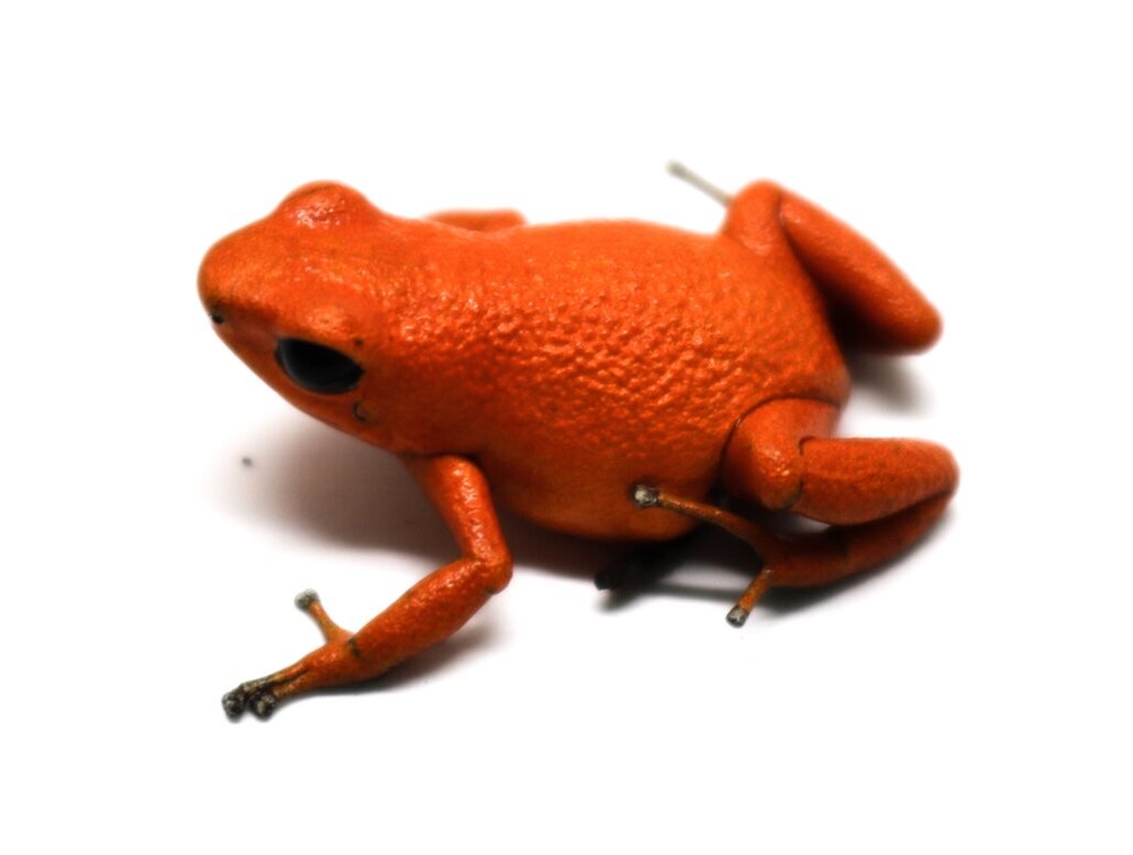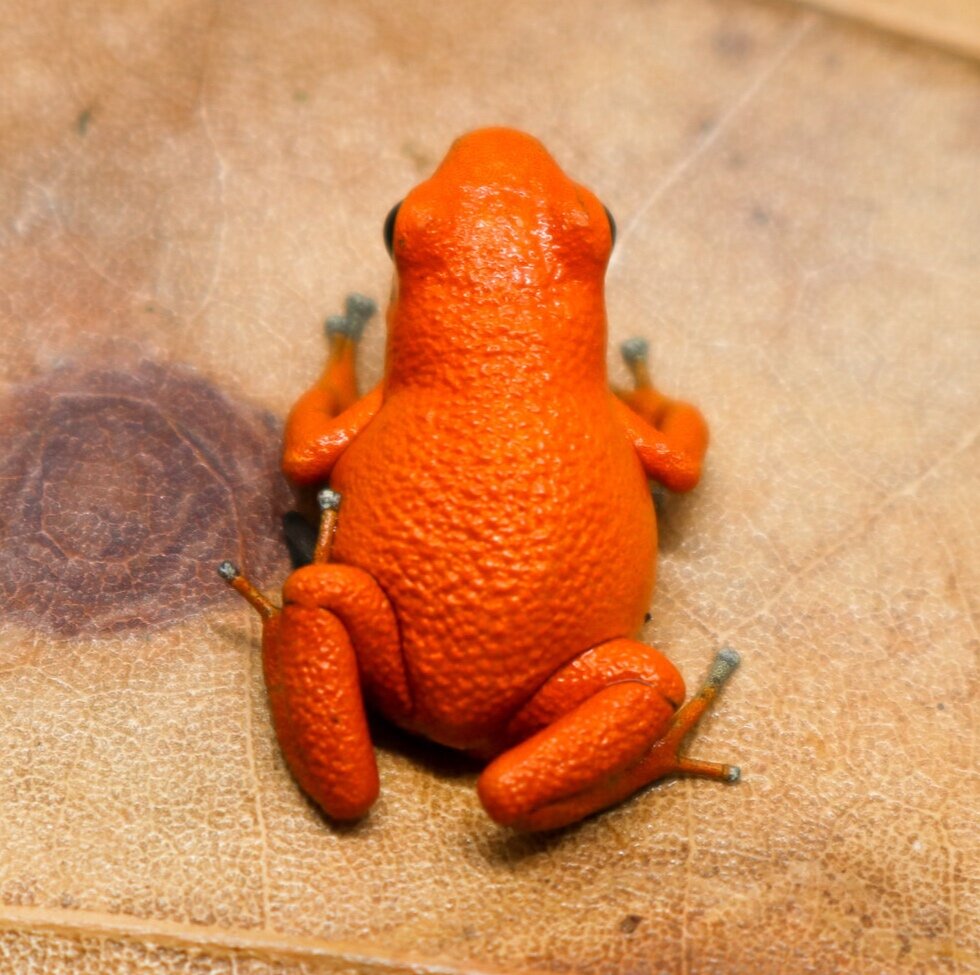 Oophaga pumilio "Solarte" are from Panama. They are usually bright orange in color. They do fine in small groups, but do best as a pair or trio when sexual maturity is reached. The males often have control of 1 to 5 square meters of territory in the wild, so rival males may display aggression for supremacy. They usually lay 3 to 10 eggs on glossy leaves, on glass, or sometimes in leaf litter. Tadpoles must be raised by adults because they feed on infertile eggs from the female. These dart frogs are interesting to many hobbyists because they exhibit biparental care. No more than a trio should go in a 20 gallon vertical conversion tank or a 18 x 24 Exo-terra enclosure. Additional information can be found, of course, through our complimentary Encyclopedia Database: DendroKnow Project.