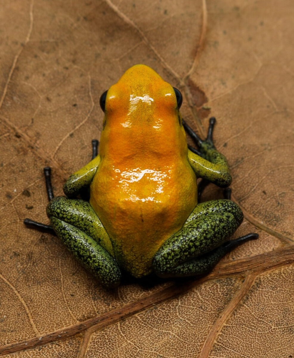 Phyllobates bicolor are found in the Choco area of Western Colombia near the San Juan river. These frogs are very bold when adults and can do moderately well in groups, provided that the enclosure is large enough. It is recommended that no more than 2 go into a 10 gallon tank, 3 in a 20 gallon tank, and 4-5 in a 40 gallon tank. There can be some aggression and wrestling, but it is usually minor. Females will generally lay 5 to 15 eggs under leaf litter or a coconut hut with flat leaves or a petri dish underneath. The frogs will transport tadpoles if left alone. Additional information can be found, of course, through our complimentary Encyclopedia Database: DendroKnow Project.