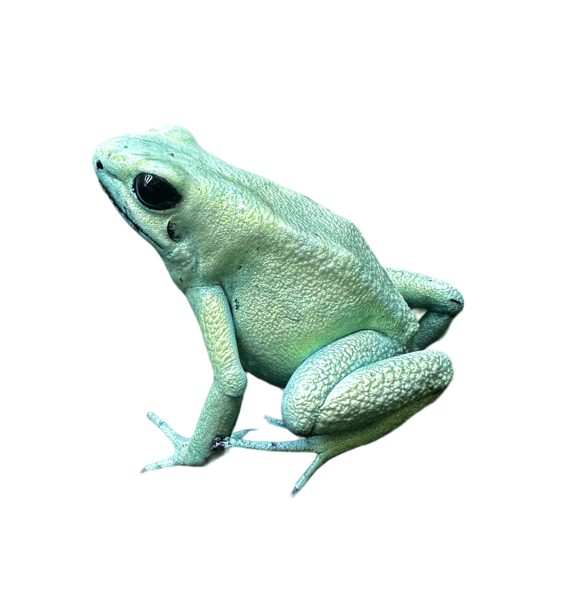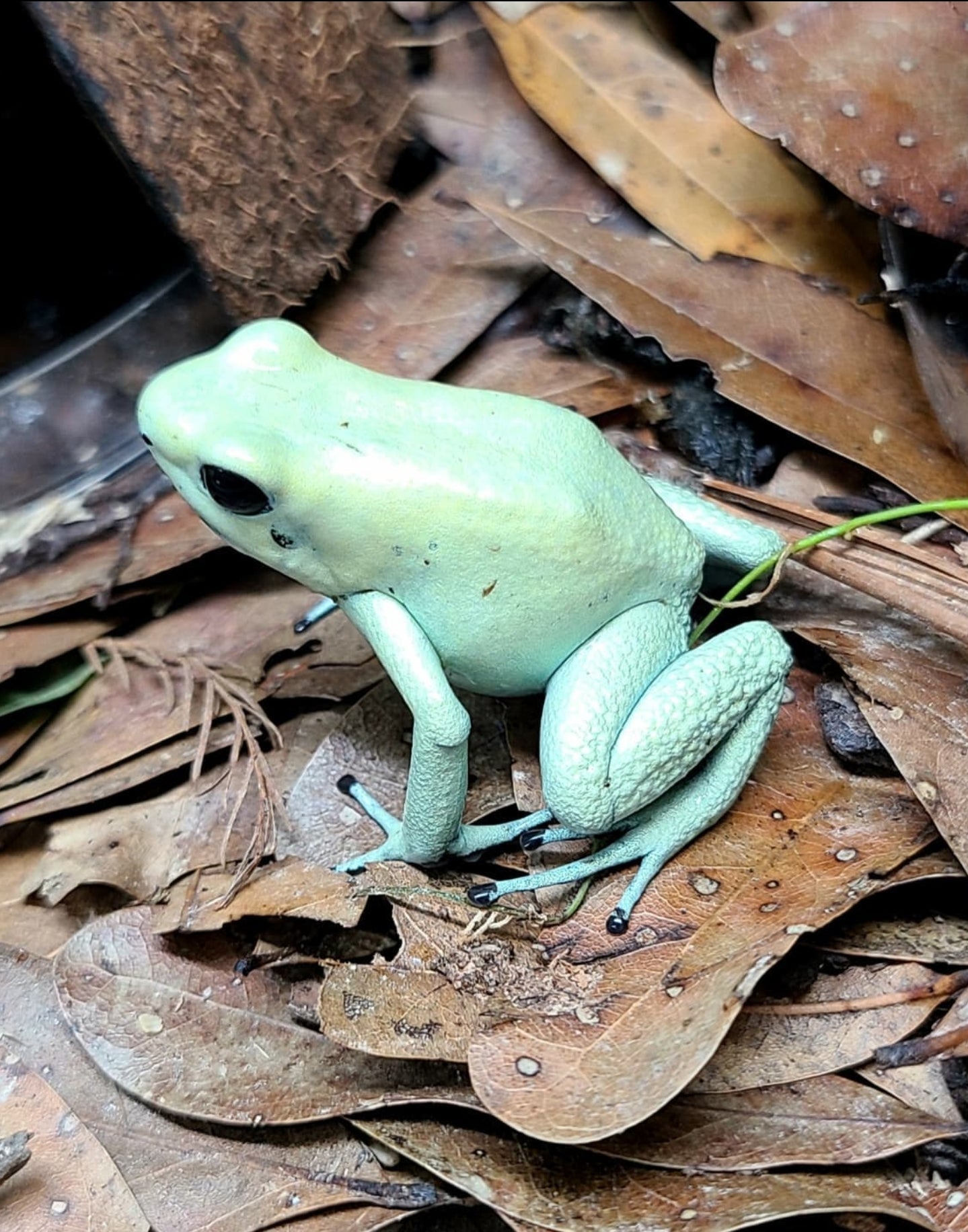 Phyllobates terribilis "Mint" are beautiful whiteish mint in color at maturity...they are the only ones of their kind! These frogs are very bold when adults and can do moderately well in groups, provided that the enclosure is large enough. It is recommended that no more than 2 go into a 10 gallon tank, 3 in a 20 gallon tank, and 4-5 in a 40 gallon tank. There can be some aggression and wrestling, but it is usually minor. Females will generally lay 5 to 15 eggs under leaf litter or a coconut hut with flat leaves or a petri dish underneath. The frogs will transport tadpoles if left alone. Additional information can be found, of course, through our complimentary Encyclopedia Database: DendroKnow Project.