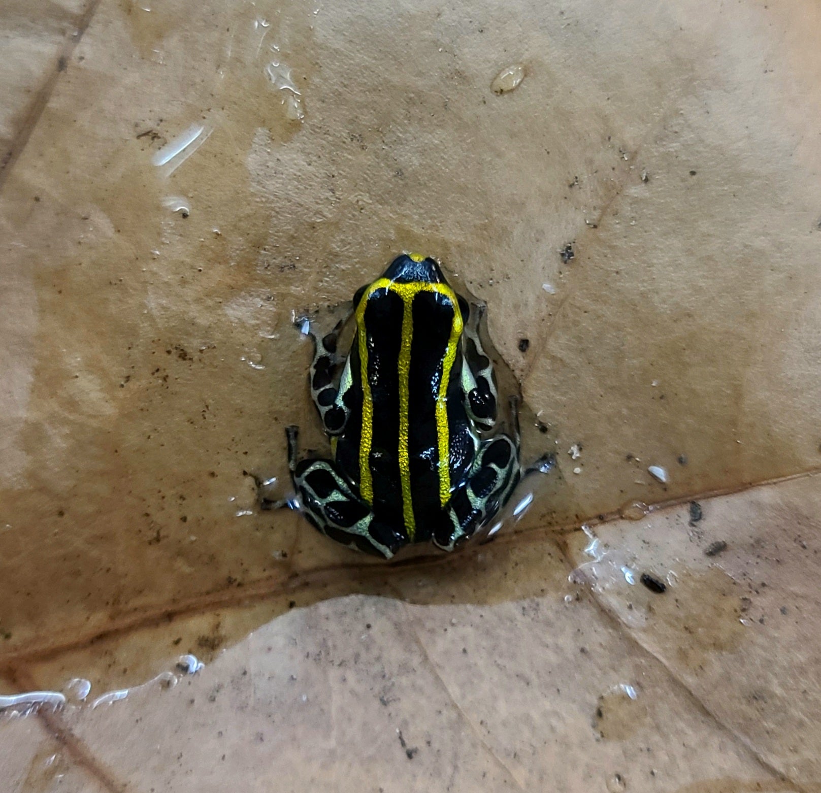Ranitomeya sirensis "Rio Pachitea Yellow" is a striped morph of sirensis found in lowland forests in Peru. They do well in pairs or trios, and have limited aggression toward one another. They are less territorial than some other Ranitomeya, like fantastica. R. sirensis usually lay 4-8 eggs in leaf litter or on vegetation, and may also lay underwater. Tadpoles can be pulled or left to be raised by adults, but may cannibalize if left with other tadpoles in proximity with less-than-adequate food. Minor egg eating may occur from rival females. No more than a pair should go in a 10 gallon vertical conversion tank or a 12 x 12 x 18 ExoTerra tank, but we recommend larger enclosures. Please contact us with further questions.