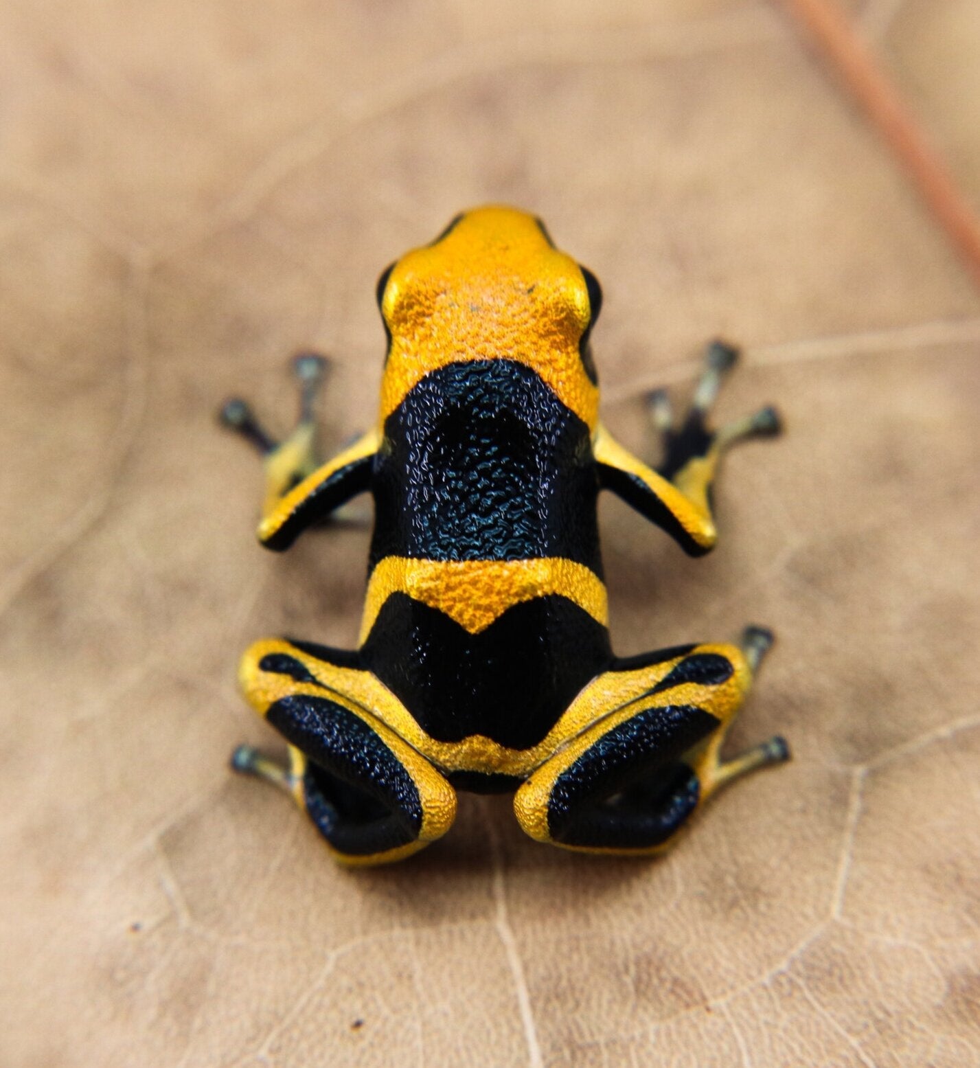 General Description: A small poison dart frog from the Genus Ranitomeya. This frog is yellow-orange and usually displays contrasting black and yellow banding / branching across the dorsal section of each limb with a crown of yellow-orange coloration upon the cephalic region. Ventral coloration is black with orange lines. These frogs generally reach around 20mm, which is rather large for Ranitomeya.