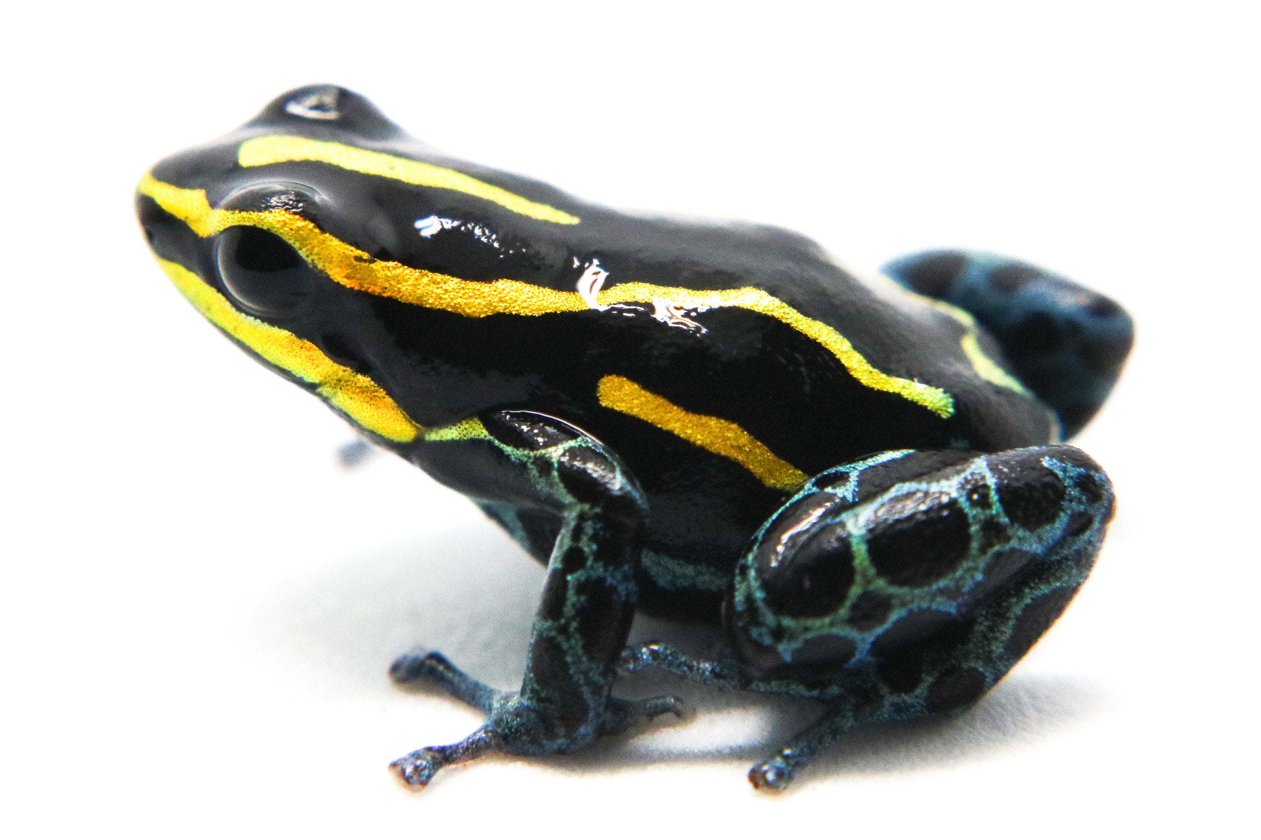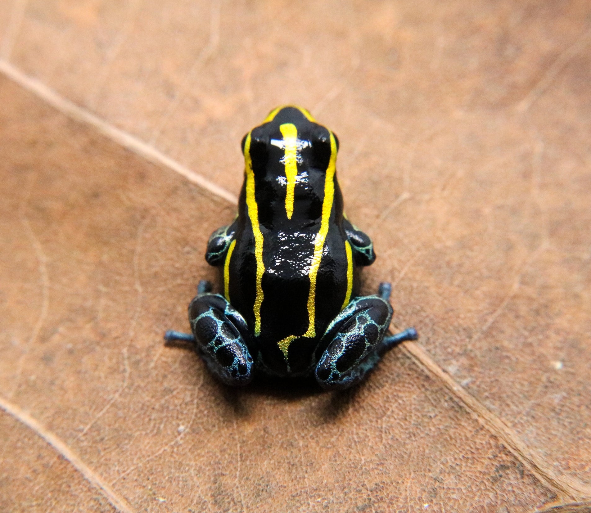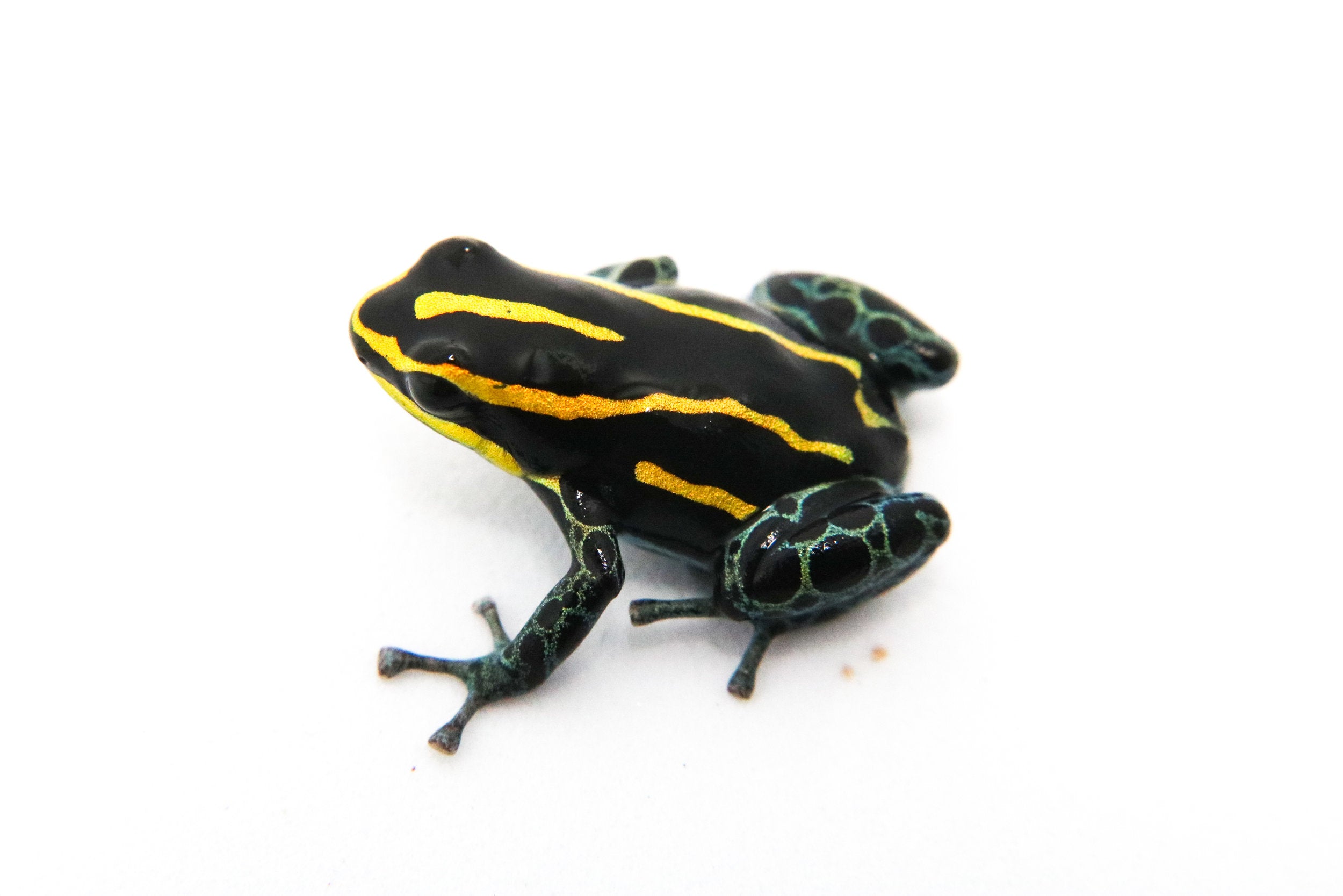 Ranitomeya variabilis "Rodyll" are beautiful frogs that come from Peru. They do well in pairs, trios, or small groups and have limited aggression toward one another. They are less territorial than some other Ranitomeya. R. variabilis usually lay 4-8 eggs underwater, or on vegetation, like amazonica. Tadpoles can be pulled or left to be raised by adults, but may cannibalize if left with other tadpoles in proximity with less-than-adequate food. Minor egg eating may occur from rival females. No more than a trio should go in a 10 gallon vertical conversion tank or a 12 x 12 x 18 ExoTerra tank, but we recommend larger enclosures. Please contact us with further questions.