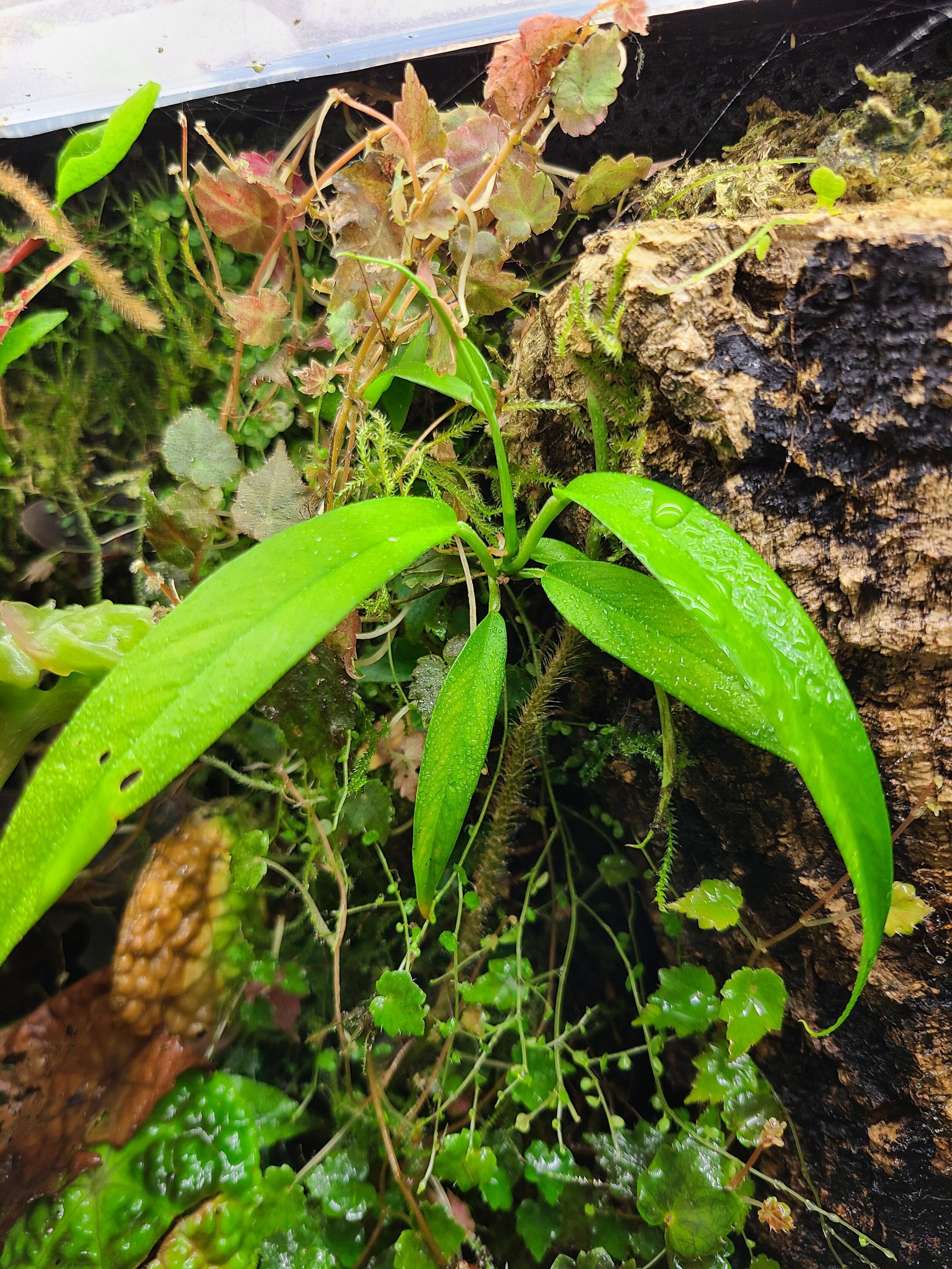 Philodendron chinchamayense is a very small plant from Peru that has small, lance-like green leaves that can reach lengths of 4 inches long, hence why it is very popular amongst dart frog enthusiasts. It is a moderate to moderately slow growing species. It does well in moderate, indirect light and moderate to high humidity, and appreciates airflow. Moist sphagnum moss is helpful for rooting this species. It can be finicky to root. Be patient with this species.
