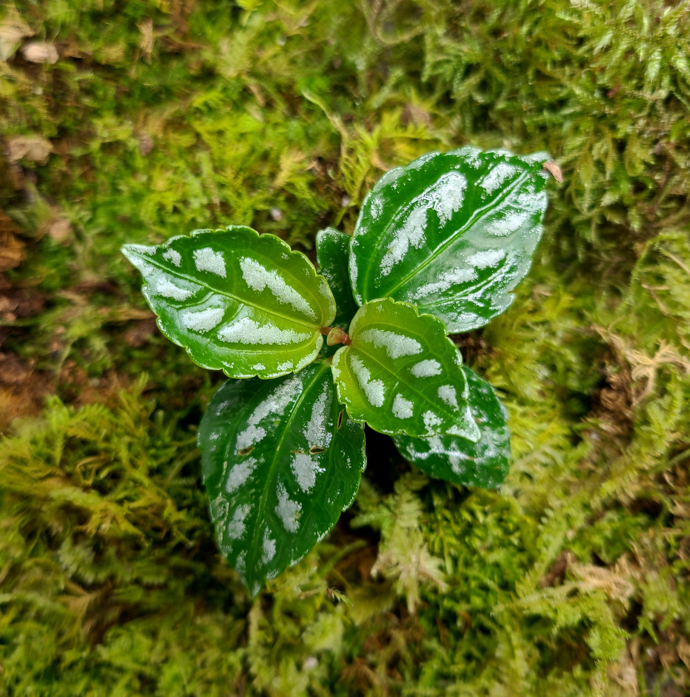 Pilea cadierei is often called the Aluminum Plant and is a fast growing species with amazing leaf patterns. This species hails from Vietnam. This Pilea does well in bright, indirect light and moderate humidity, but can tolerate lower light conditions. It does not require much ventilation. Moist soil and sphagnum moss are helpful for rooting this species. It roots quickly, and can be pruned to create plantlets and interesting structures. You can snip off just under wherever aerial roots form and replant it. These Pilea are easy to propagate.