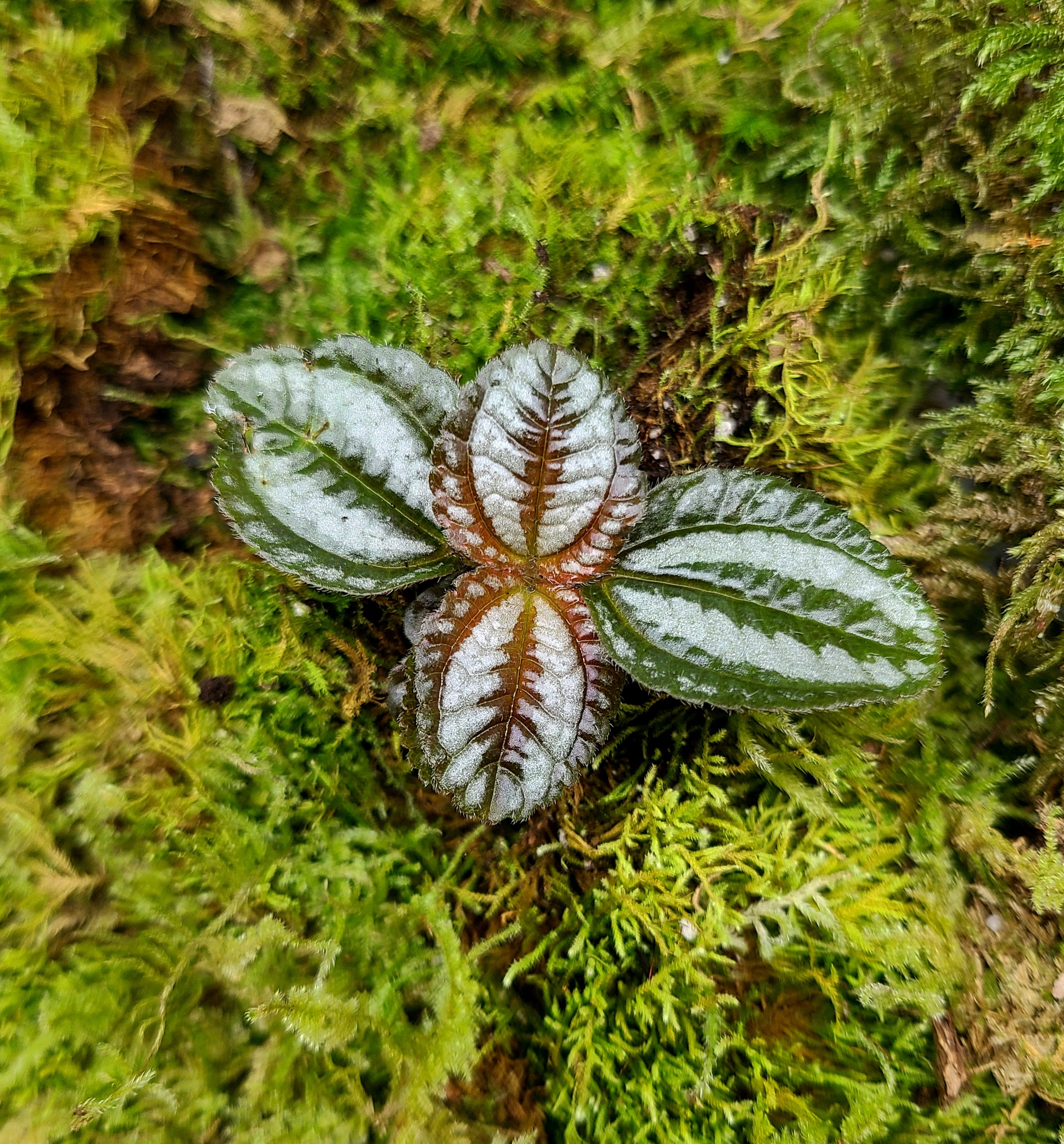 Pilea ovalis is often called the Friendship Plant and is a fast growing species with amazing leaf patterns. This species hails from Central and South America. This Pilea does well in bright, indirect light and moderate humidity, but can tolerate lower light conditions. It does not require much ventilation. Moist soil and sphagnum moss are helpful for rooting this species. It roots quickly, and can be pruned to create plantlets and interesting structures. You can snip off just under wherever aerial roots form and replant it. These Pilea are easy to propagate.