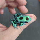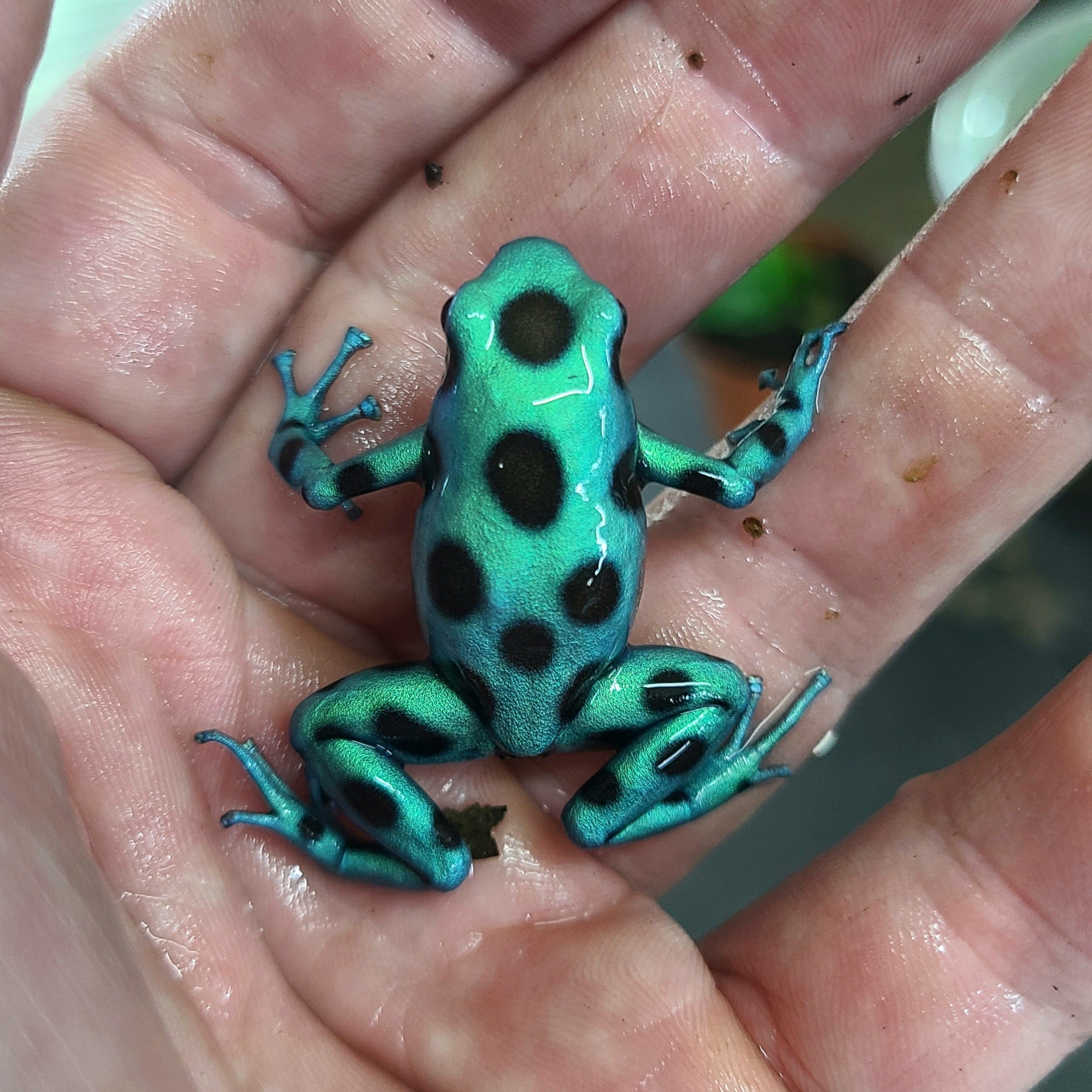 Dendrobates auratus "Microspot" hail from Panama. These are beautiful frogs that have a shiny, bright blue and green skin with black spots. This frog is moderately shy, and does well in groups. They get bolder with age and exposure, like others of their species. There will be some aggression and wrestling between females, while males do not tend to partake in fighting often. Despite this, you can keep a decently large group of frogs together, even as adults, provided that there are plenty of hiding places and food available. Females will generally lay 4 to 10 eggs under leaf litter or a coconut hut with flat leaves or a petri dish underneath. They will then transport tadpoles to a body of water, like tinctorius. However, you may pull the eggs and raise them yourself. If left alone, the tadpoles will cannibalize. Please let us know if you have any questions. Additional information can be found, of course, through our complimentary Encyclopedia Database: DendroKnow Project.