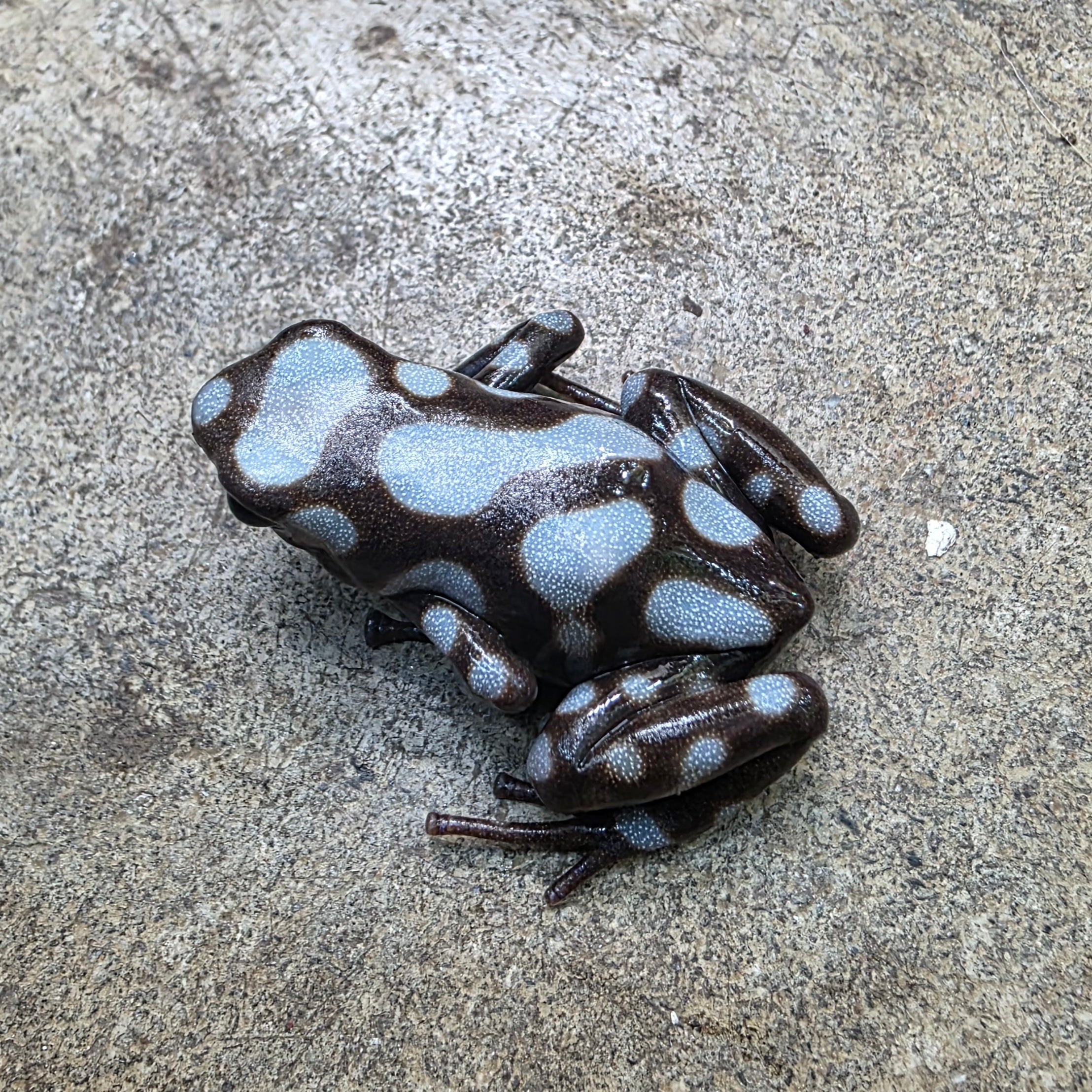 Dendrobates auratus "Rio Cascajal" hail from the shores of the Rio Cascajal in Panama. This frog has creamy bluish-white markings with a black-bronze reticulation. This frog is moderately shy, and does well in groups. They get bolder with age and exposure, like others of their species. There will be some aggression and wrestling between females, while males do not tend to partake in fighting often. Despite this, you can keep a decently large group of frogs together, even as adults, provided that there are plenty of hiding places and food available. Females will generally lay 4 to 10 eggs under leaf litter or a coconut hut with flat leaves or a petri dish underneath. They will then transport tadpoles to a body of water, like tinctorius. However, you may pull the eggs and raise them yourself. If left alone, the tadpoles will cannibalize. Please let us know if you have any questions. Additional information can be found, of course, through our complimentary Encyclopedia Database: DendroKnow Project.