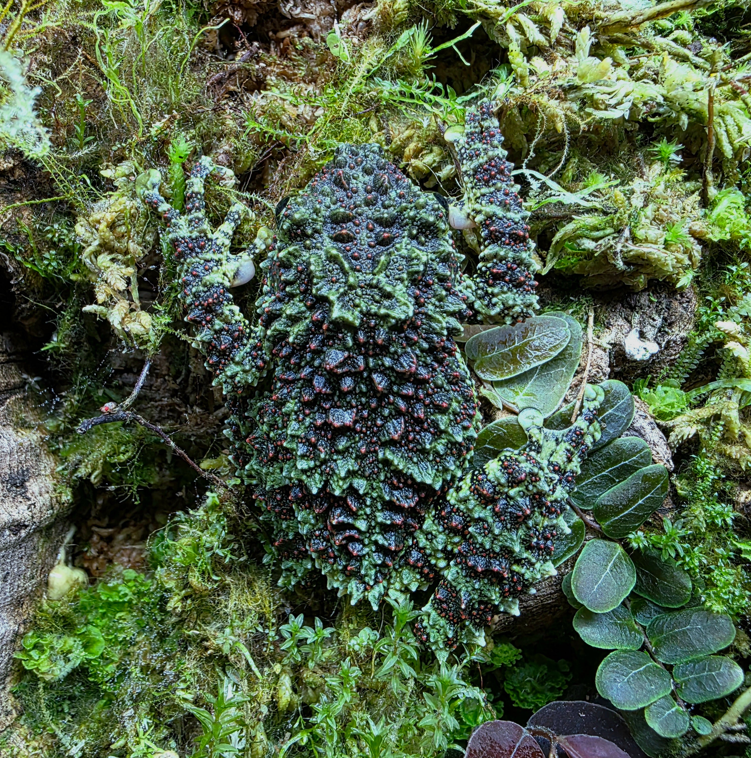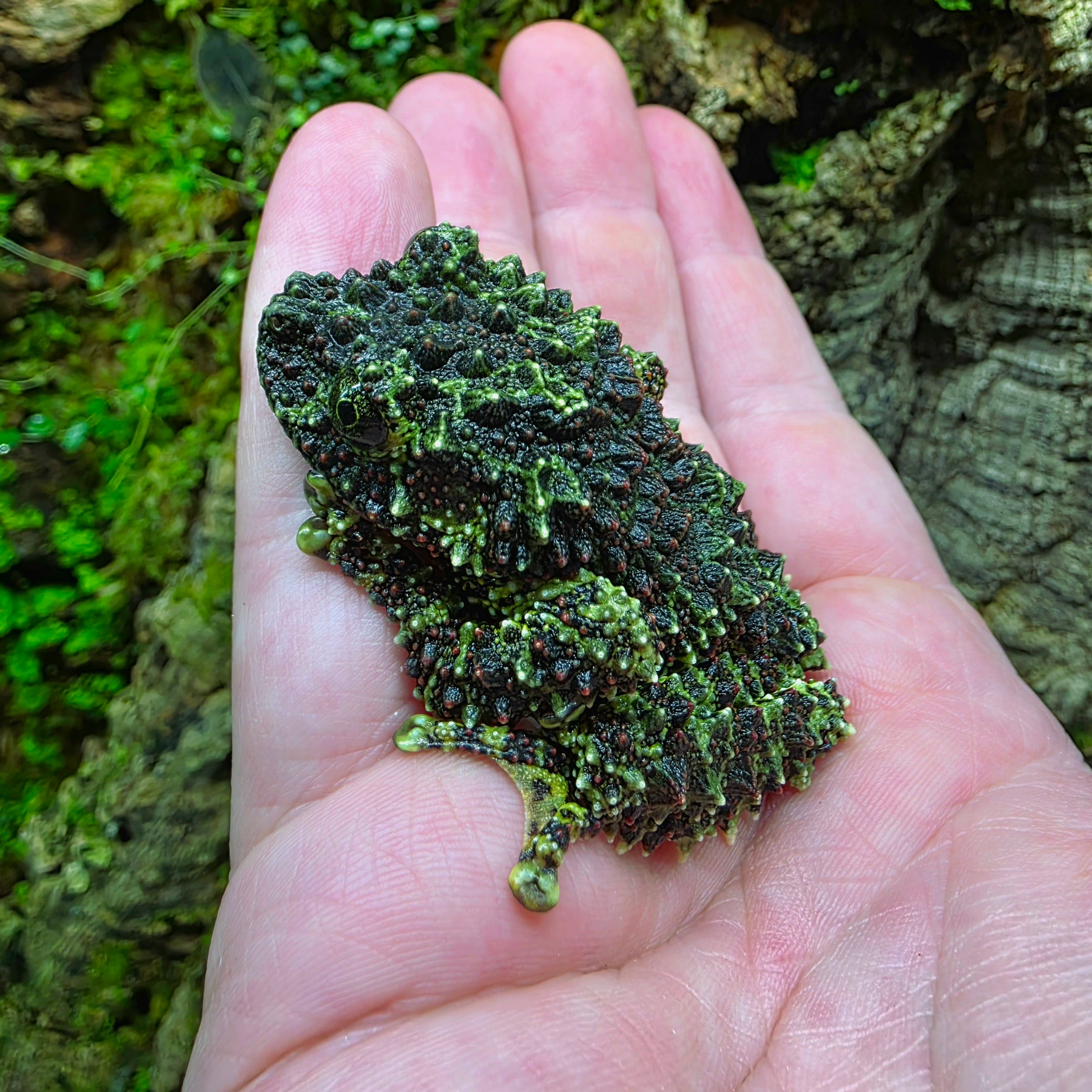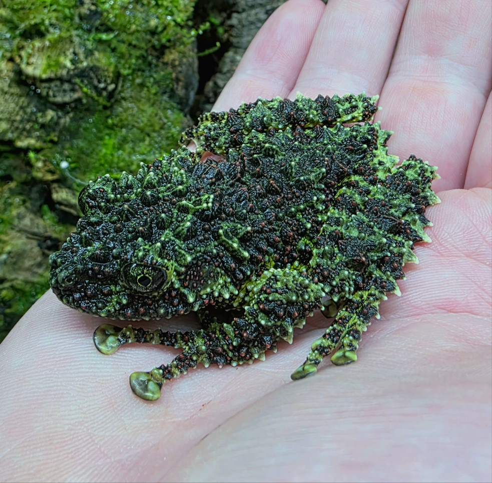 Theloderma corticale are amazing frogs with one of a kind patterns. They do best in a paludarium that is spacious enough for them to freely jump and move around. They are nocturnal and males have a soft, cute call. They do well in groups, but more than a pair will need a 24x18x24 vivarium or larger. High humidity is a plus, and they need to be kept at around 70-74 degrees, no higher. Keep a water dish unless you have clean water in your vivarium.