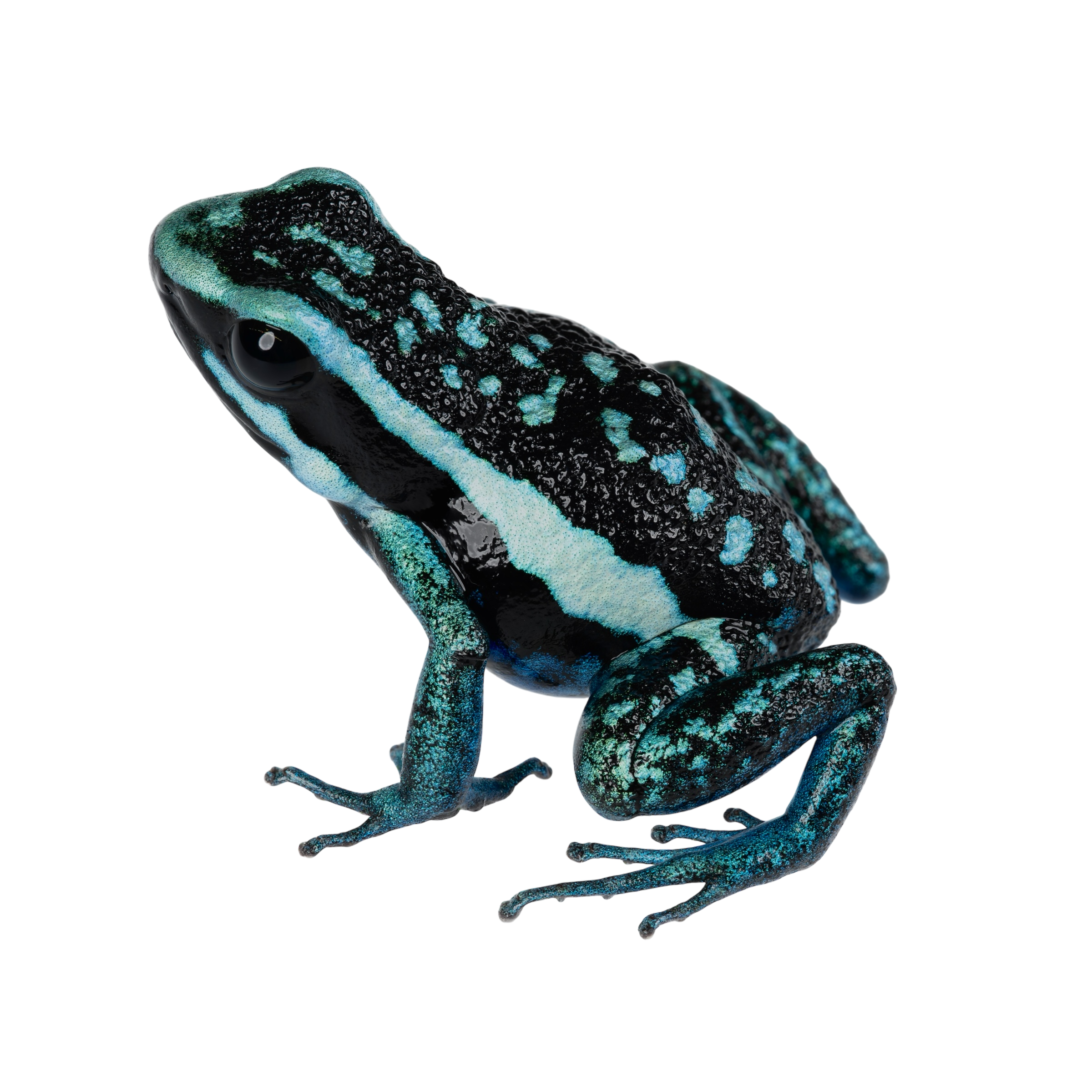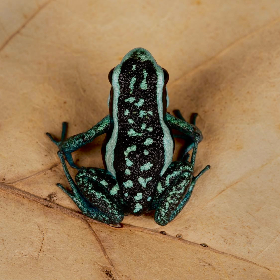 Ameerega bassleri are found in Peru. These frogs are very beautiful and are dark blue to black with turquoise lines. They have very bumpy skin. These frogs are moderately shy to bold depending on age, and can do moderately well in groups, provided that the enclosure is large enough. It is recommended that no more than 2 go into a 10 gallon tank, 3 in a 20 gallon tank, and 4-5 in a 40 gallon tank. There can be some aggression and wrestling, but it is usually minor. Females will generally lay 10 to 20 eggs under leaf litter, on foliage, or under a coconut hut with flat leaves or a petri dish underneath. The frogs will transport tadpoles if left alone. Additional information can be found, of course, through our complimentary Encyclopedia Database: DendroKnow Project.