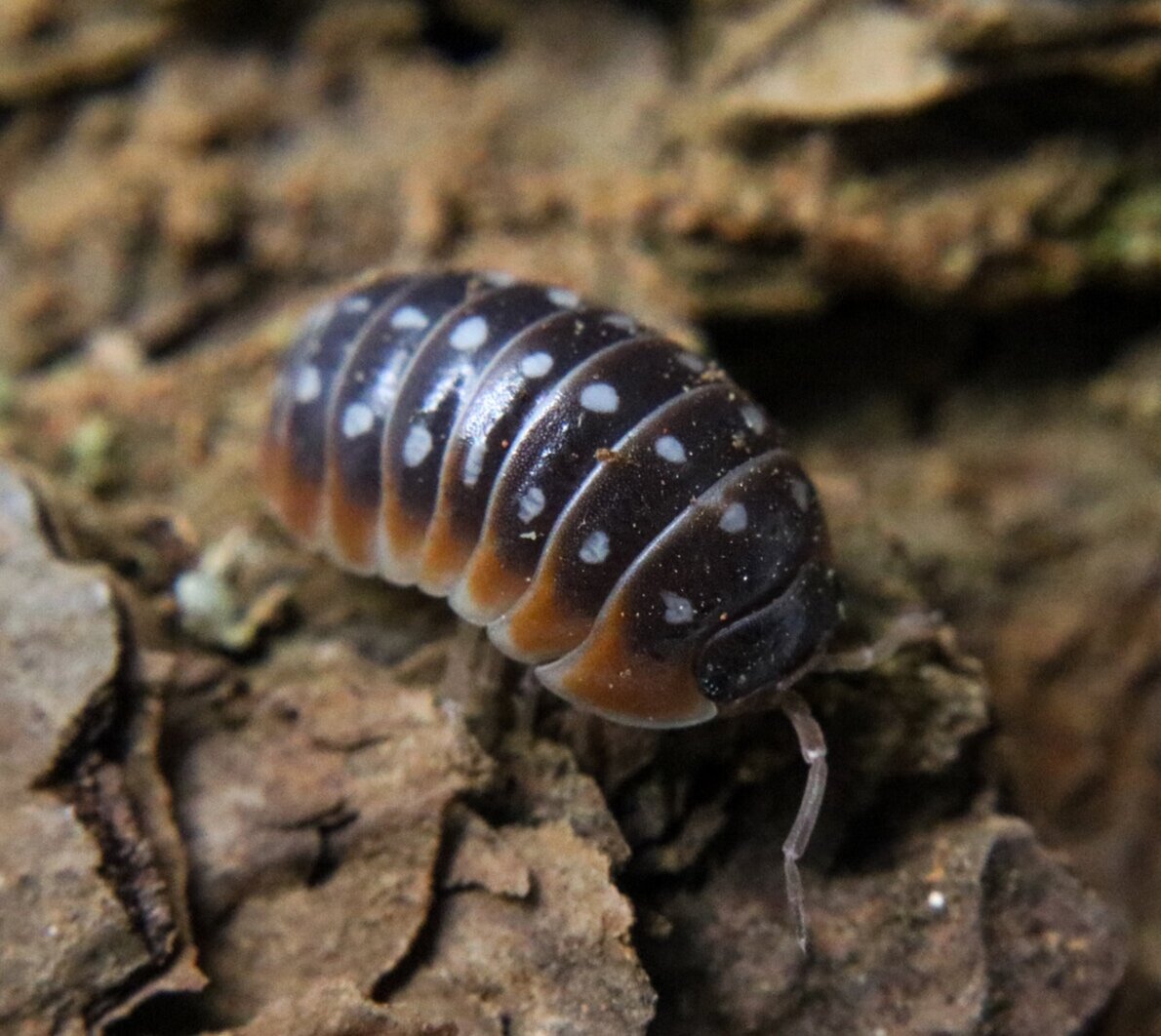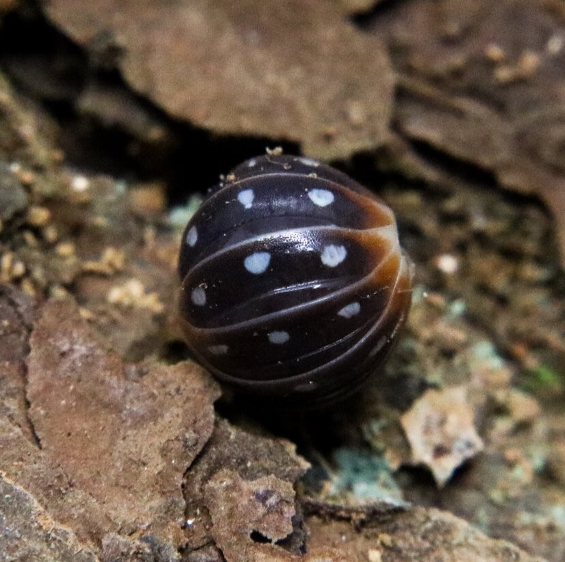 Armadillidium klugii "Dubrovnik" are clown Isopods that establish moderately quickly in a vivarium, and will act as janitors to keep the vivarium clean, as well as a snack that provides a natural calcium boost. They are native to Croatia. These isopods have a hard, calcified body, and are prized for their spots and unique colors. They are quite large as adults, but the younger ones are palatable and are eaten by amphibians, invertebrates, and reptiles. Larger amphibians and reptiles will consume adults as well, but not poison dart frogs. Usually, hobbyists do not keep them with predators, but rather as pets / trades in the isopod hobby. Our isopods are fed Iso-licious Isopod Food 1-2x a week, including our new wet mixes, supplemented with potatoes, squash, carrots, our leaf powder, and a cuttlebone. These isopods enjoy warm temperatures and an occasional misting, but do not do as well in an extremely wet environment. We allow space for a moderate moisture gradient, starting with one side of the enclosure having wet NZ sphagnum moss, the middle being moist and mostly covered with leaf litter and bark, and onto the opposite side being completely dry and covered only with leaf litter. This provides the needed space for Isopods to osmoregulate to remain in homeostasis.