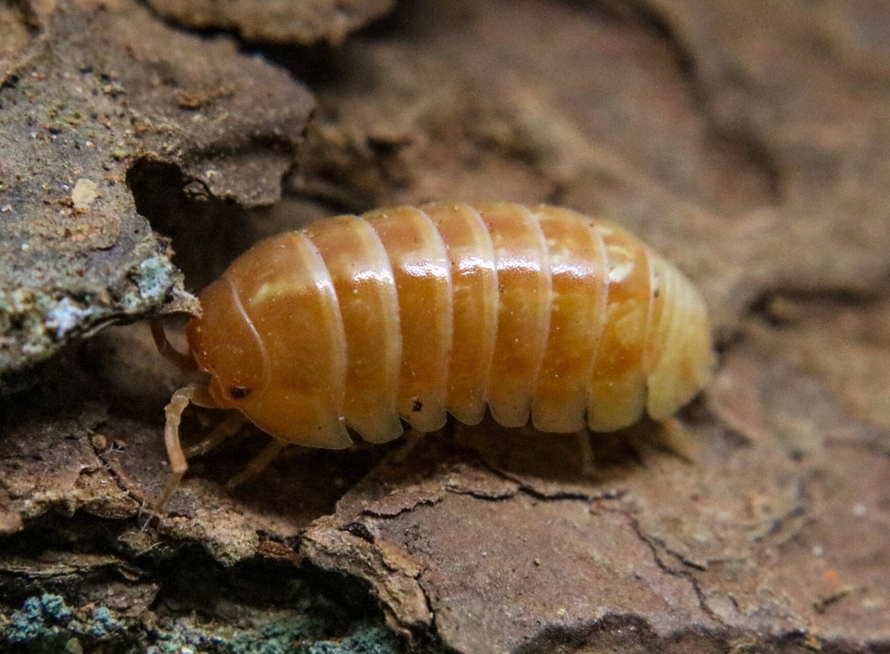 Armadillidium vulgare "Punta Cana" establish moderately in a vivarium, and will act as janitors to keep the vivarium clean, as well as a snack that provides a natural calcium boost. These isopods are absolutely stunning and come in a plethora of colors ranging from deep gray to creamy orange with stripes! These are native to the Dominican Republic. They are moderately large as adults, but the younger ones are palatable and are eaten by amphibians, invertebrates, and reptiles. Larger amphibians and reptiles will consume adults as well, but not poison dart frogs. Our isopods are fed Iso-licious Isopod Food 1-2x a week, including our new wet mixes, supplemented with potatoes, squash, carrots, our leaf powder, and a cuttlebone. These isopods enjoy warm temperatures and an occasional misting, but do not do as well in an extremely wet environment. We allow space for a moderate moisture gradient, starting with one side of the enclosure having wet NZ sphagnum moss, the middle being moist and mostly covered with leaf litter and bark, and onto the opposite side being completely dry and covered only with leaf litter. This provides the needed space for Isopods to osmoregulate to remain in homeostasis.