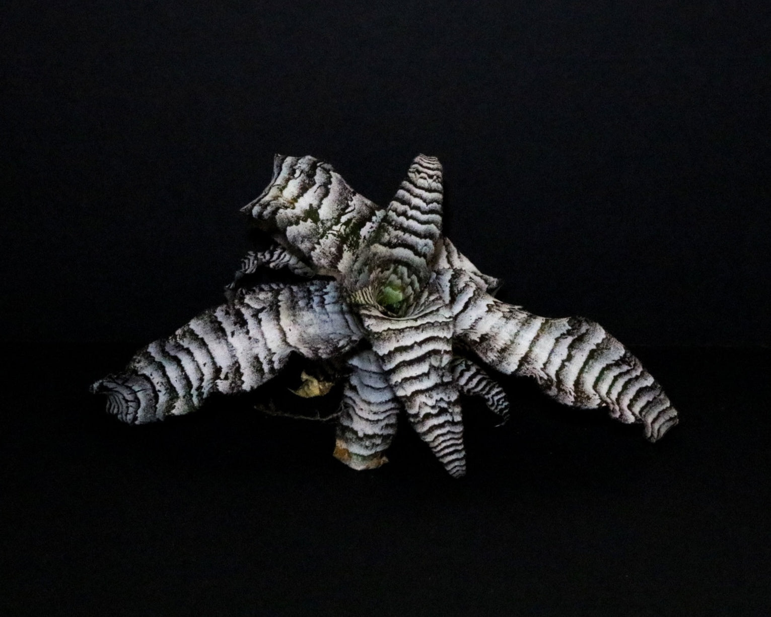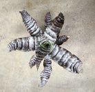 Cryptanthus "Absolute Zero" is a large growing Cryptanthus. This genus is in the Bromeliad family and is native to Brazil. It has bright white and dark purple stripes that are striated in pattern. This is a stunning plant. The mature plant can reach over 18 inches in diameter, and is an impressive sight to behold. It grows moderately slowly in a vivarium and does best under very bright, indirect light with moderate humidity. Airflow is helpful. Moist soil and sphagnum moss are helpful for rooting this species, but it can root on many substrates. Do not let it sit in water.