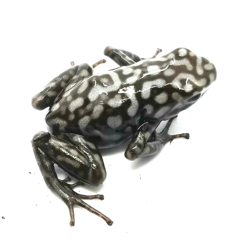 Dendrobates auratus "Pena Blanca" hail from Guatemala. This frog starts as a dull brown and blue and turns into a white and black frog with metallic bronzing. This frog is moderately shy, and does well in groups. They get bolder with age and exposure, like others of their species. There will be some aggression and wrestling between females, while males do not tend to partake in fighting often. Despite this, you can keep a decently large group of frogs together, even as adults, provided that there are plenty of hiding places and food available. Females will generally lay 4 to 10 eggs under leaf litter or a coconut hut with flat leaves or a petri dish underneath. They will then transport tadpoles to a body of water, like tinctorius. However, you may pull the eggs and raise them yourself. If left alone, the tadpoles will cannibalize. Please let us know if you have any questions. Additional information can be found, of course, through our complimentary Encyclopedia Database: DendroKnow Project.