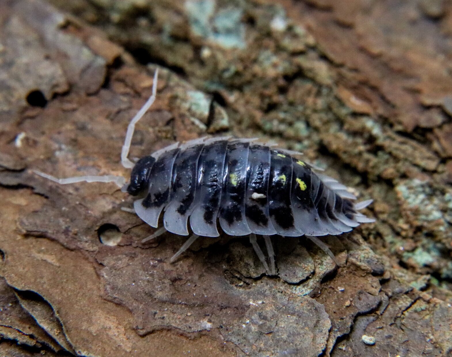 Oniscus asellus "Mardi Gras Dalmatian" establish moderately slowly in a vivarium, and will act as janitors to keep the vivarium clean, as well as a snack that provides a natural calcium boost. They are native to North America. They have nice, flat bodies and hold the "magic potion" genes. They are quite large as adults, but the younger ones are palatable and are eaten by amphibians, invertebrates, and reptiles. Our isopods are fed Iso-licious Isopod Food 1-2x a week, including our new wet mixes, supplemented with potatoes, squash, carrots, our leaf powder, and a cuttlebone. These isopods enjoy cooler temperatures and an occasional misting, but do not do as well in an extremely wet environment. We allow space for a moderate moisture gradient, starting with one side of the enclosure having wet NZ sphagnum moss, the middle being moist and mostly covered with leaf litter and excessive levels of bark, and onto the opposite side being completely dry and covered only with leaf litter. This provides the needed space for Isopods to osmoregulate to remain in homeostasis.