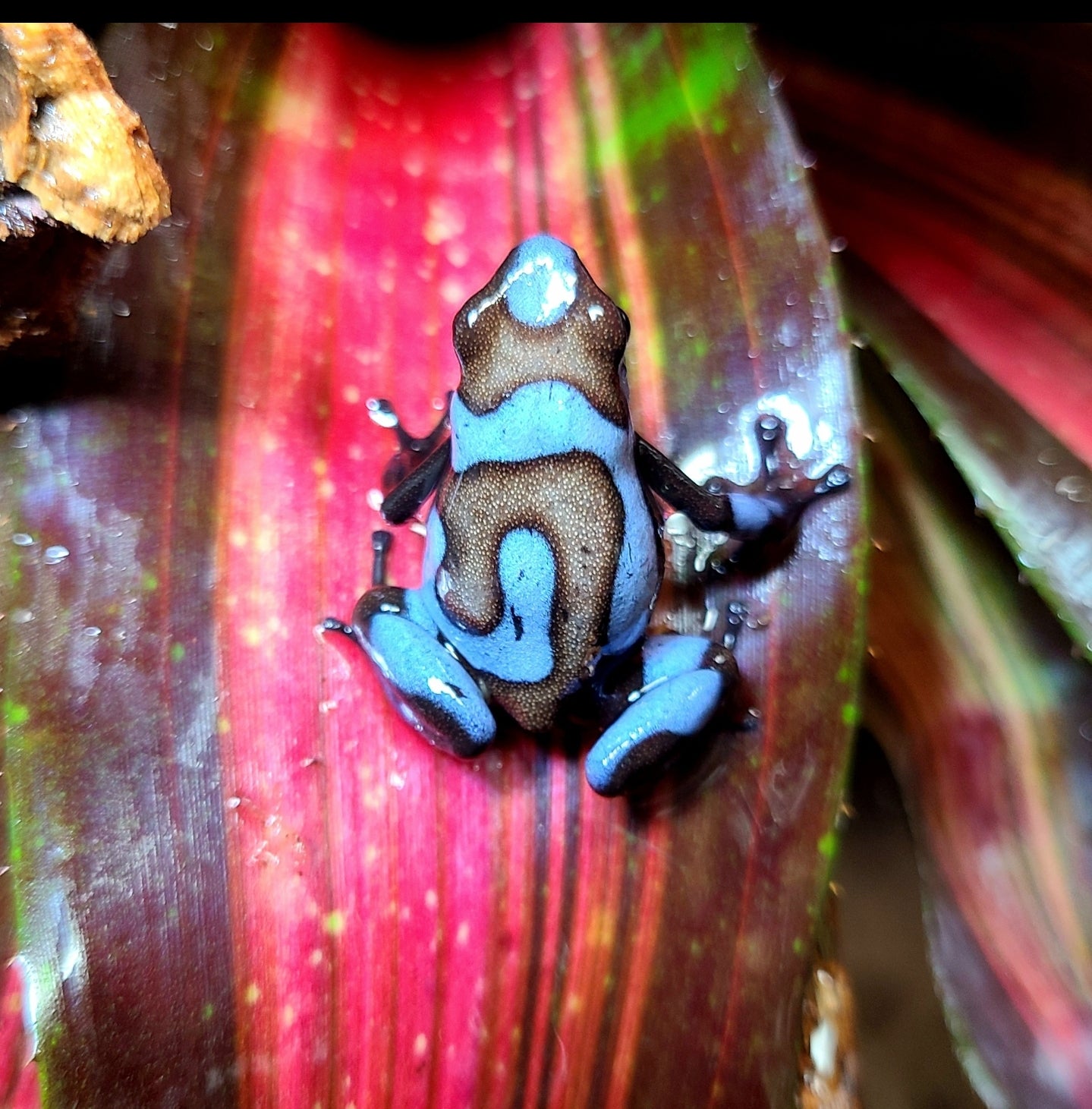 Oophaga histrionica “Blue” are found in Columbia. These frogs have brilliant blue markings and bronze reticulation. These are large obligate egg feeding frogs. These frogs feed their young with infertile eggs after depositing them in bromeliad axils. Large obligates are best kept in pairs in a minimum terrarium size of 24 x 24 / 18 x 36, but appreciate larger enclosures. These frogs can be difficult to breed, so have patience. The females generally lay clutches of 2-10, and tadpoles can take 120 days or more to morph into froglets, but generally take around 90 days. Pairs usually produce 4-6 offspring per year. Additional information can be found, of course, through our complimentary Encyclopedia Database: DendroKnow Project.