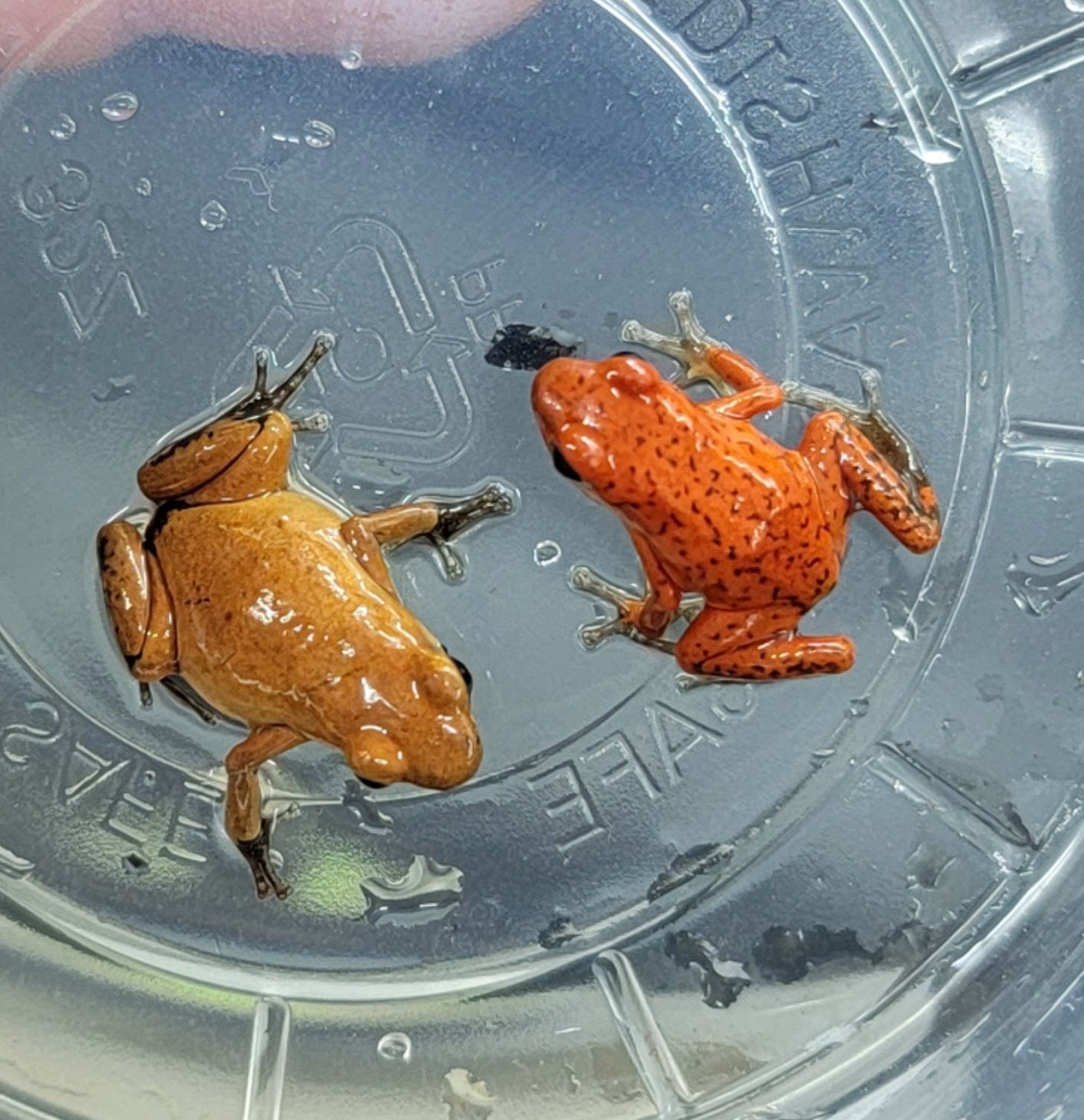 Oophaga pumilio "El Dorado" is a beautiful pumilio that often is bright to dull orange in color. These hail from a large area in Panama. The "solid" locality information is not known from what we know. They do fine in small groups, but do best as a pair or trio when sexual maturity is reached. The males often have control of 1 to 5 square meters of territory in the wild, so rival males may display aggression for supremacy. They usually lay 3 to 10 eggs on glossy leaves, on glass, or sometimes in leaf litter. Tadpoles must be raised by adults because they feed on infertile eggs from the female. These dart frogs are interesting to many hobbyists because they exhibit biparental care. No more than a trio should go in a 20 gallon vertical conversion tank or a 18 x 24 Exo-terra enclosure. Additional information can be found, of course, through our complimentary Encyclopedia Database: DendroKnow Project.