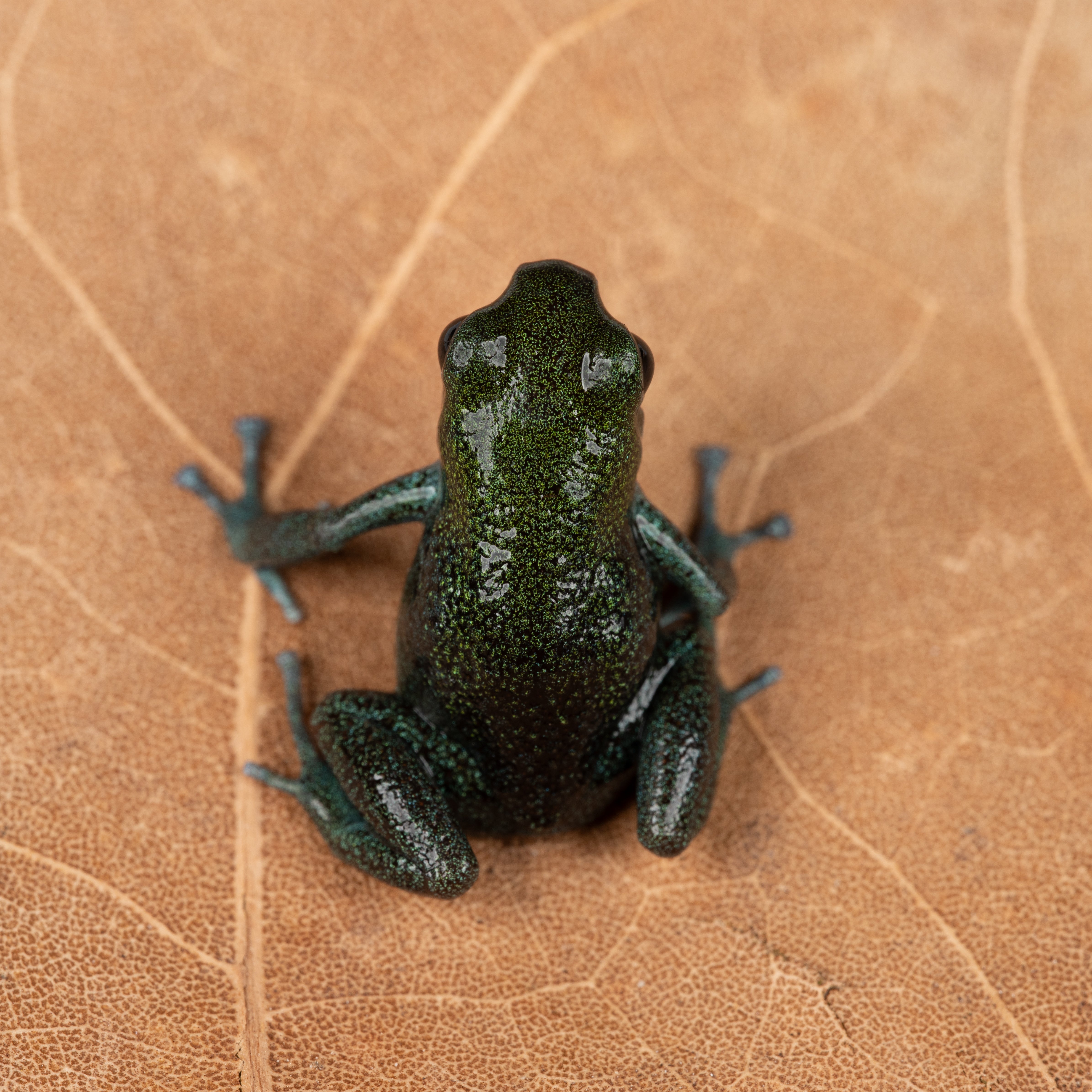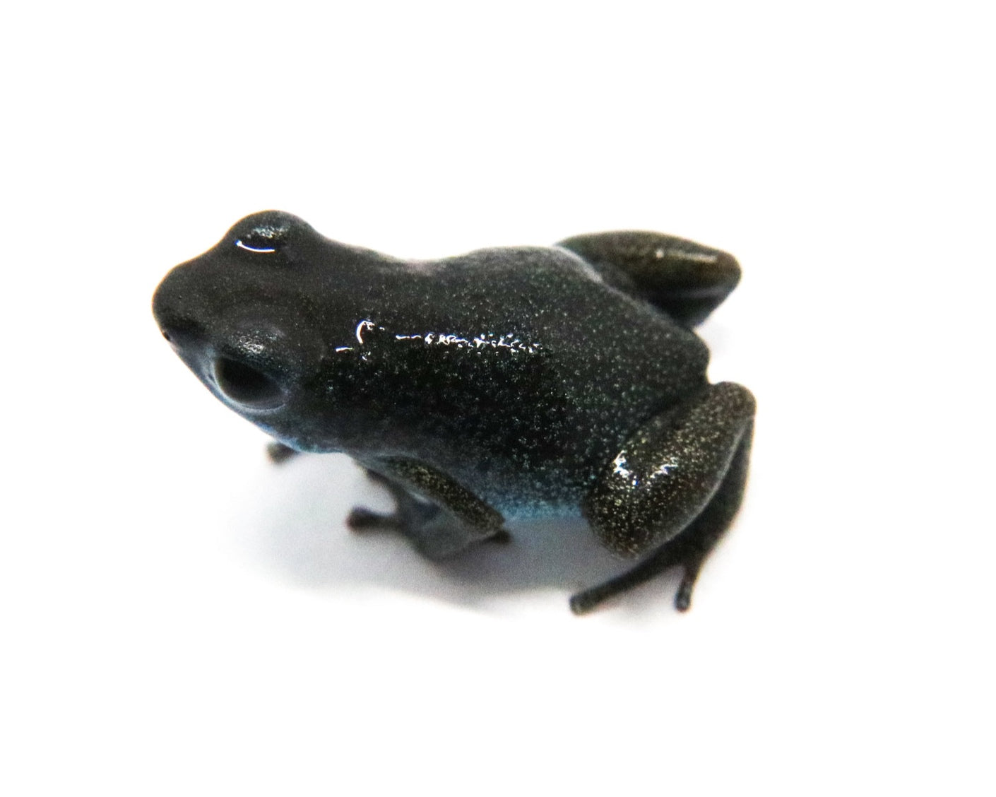 Oophaga pumilio "Loma Partida" is a small poison dart frog that inhabits Loma Partida, Panama. Their coloration resembles the night sky up close, so don't be fooled at first glance! They do fine in small groups, but do best as a pair or trio when sexual maturity is reached. The males often have control of 1 to 5 square meters of territory in the wild, so rival males may display aggression for supremacy. They usually lay 3 to 10 eggs on glossy leaves, on glass, or sometimes in leaf litter. Tadpoles must be raised by adults because they feed on infertile eggs from the female. These dart frogs are interesting to many hobbyists because they exhibit biparental care. No more than a trio should go in a 20 gallon vertical conversion tank or a 18 x 24 Exo-terra enclosure. Additional information can be found, of course, through our complimentary Encyclopedia Database: DendroKnow Project.