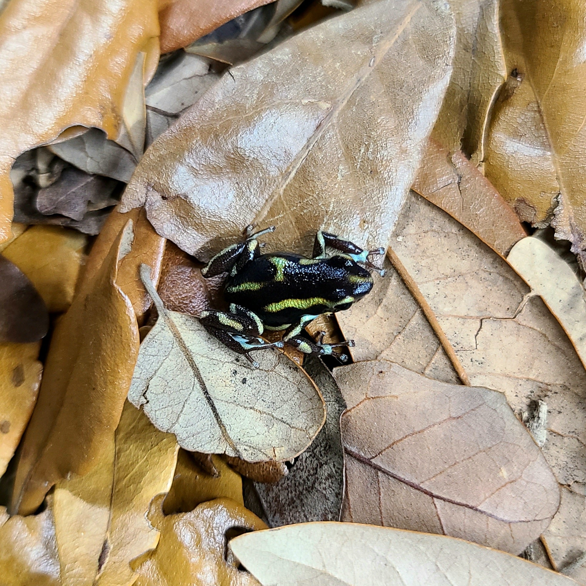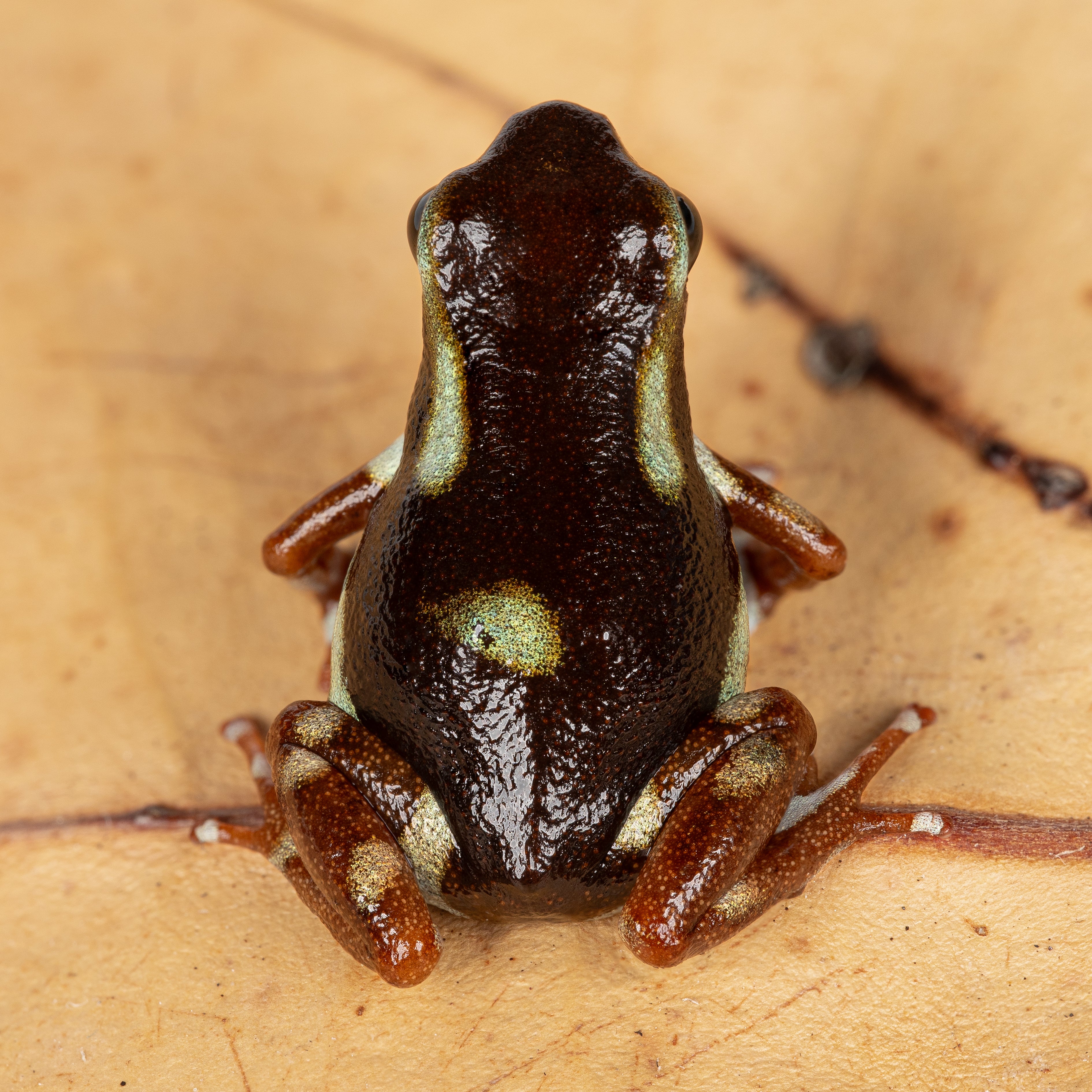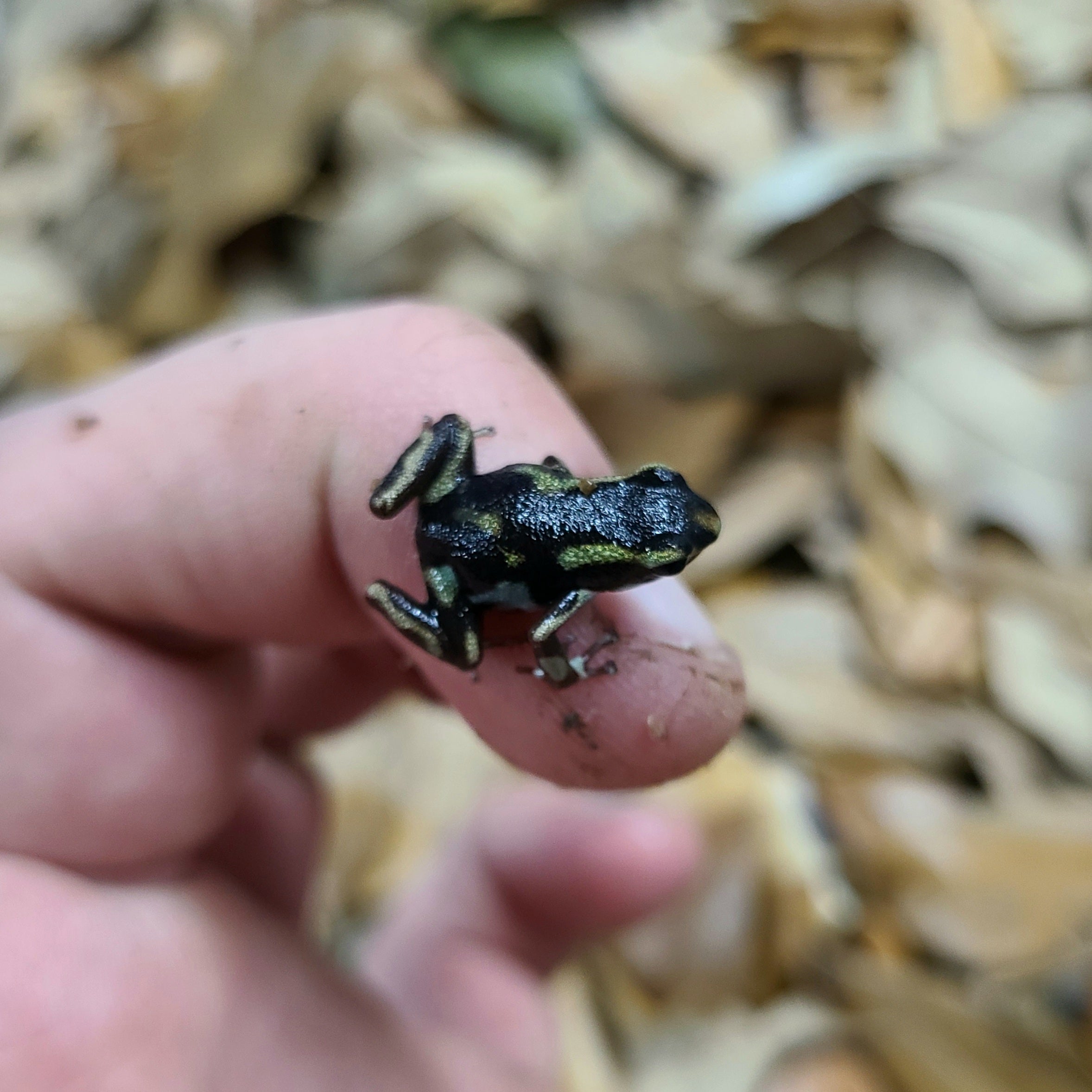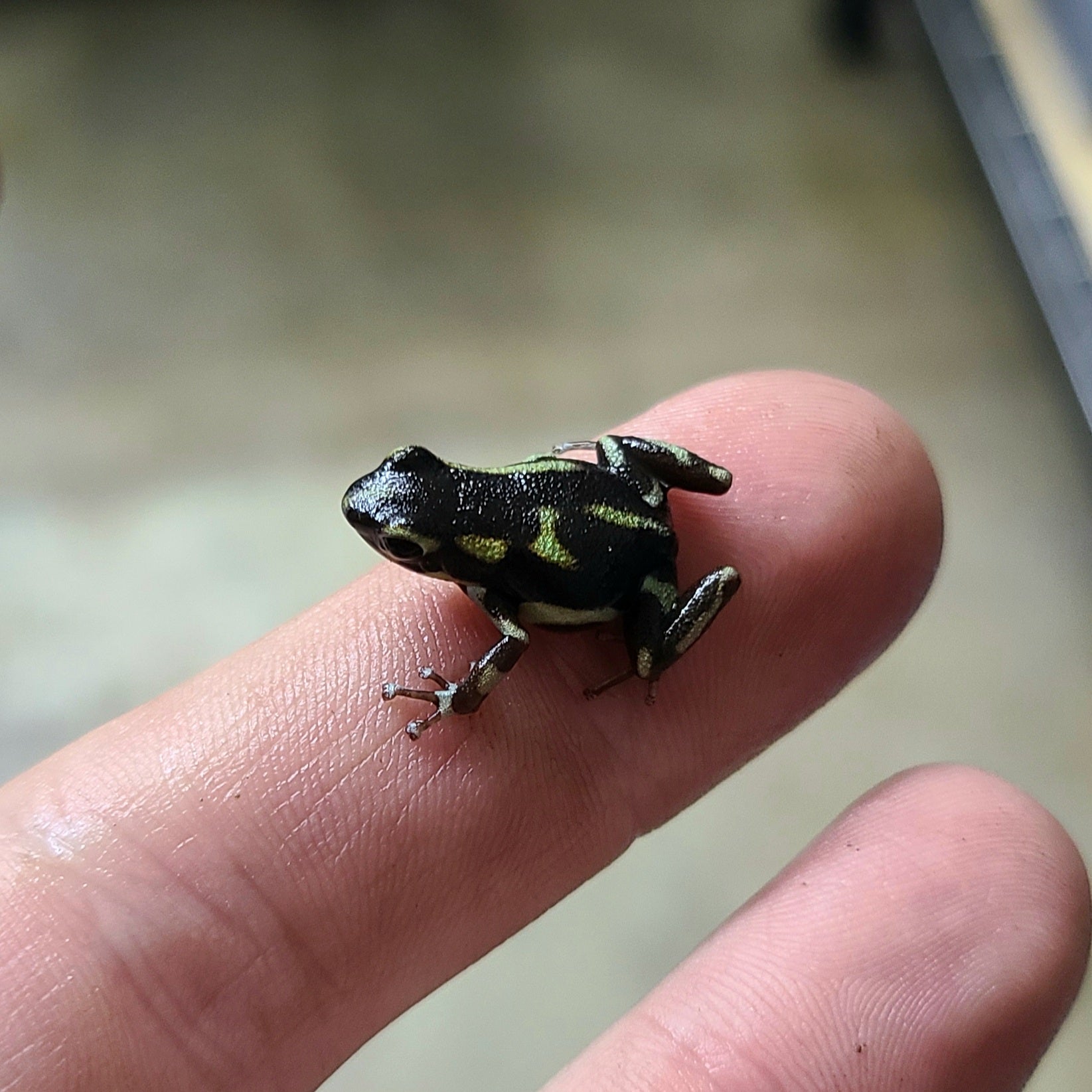 Oophaga pumilio "Robalo is a small poison dart frog that inhabits Panama. These frogs are brown and white with light blue coloration ascending from the ventral region. They do fine in small groups, but do best as a pair or trio when sexual maturity is reached. The males often have control of 1 to 5 square meters of territory in the wild, so rival males may display aggression for supremacy. They usually lay 3 to 10 eggs on glossy leaves, on glass, or sometimes in leaf litter. Tadpoles must be raised by adults because they feed on infertile eggs from the female. These dart frogs are interesting to many hobbyists because they exhibit biparental care. No more than a trio should go in a 20 gallon vertical conversion tank or a 18 x 24 Exo-terra enclosure. Additional information can be found, of course, through our complimentary Encyclopedia Database: DendroKnow Project.
