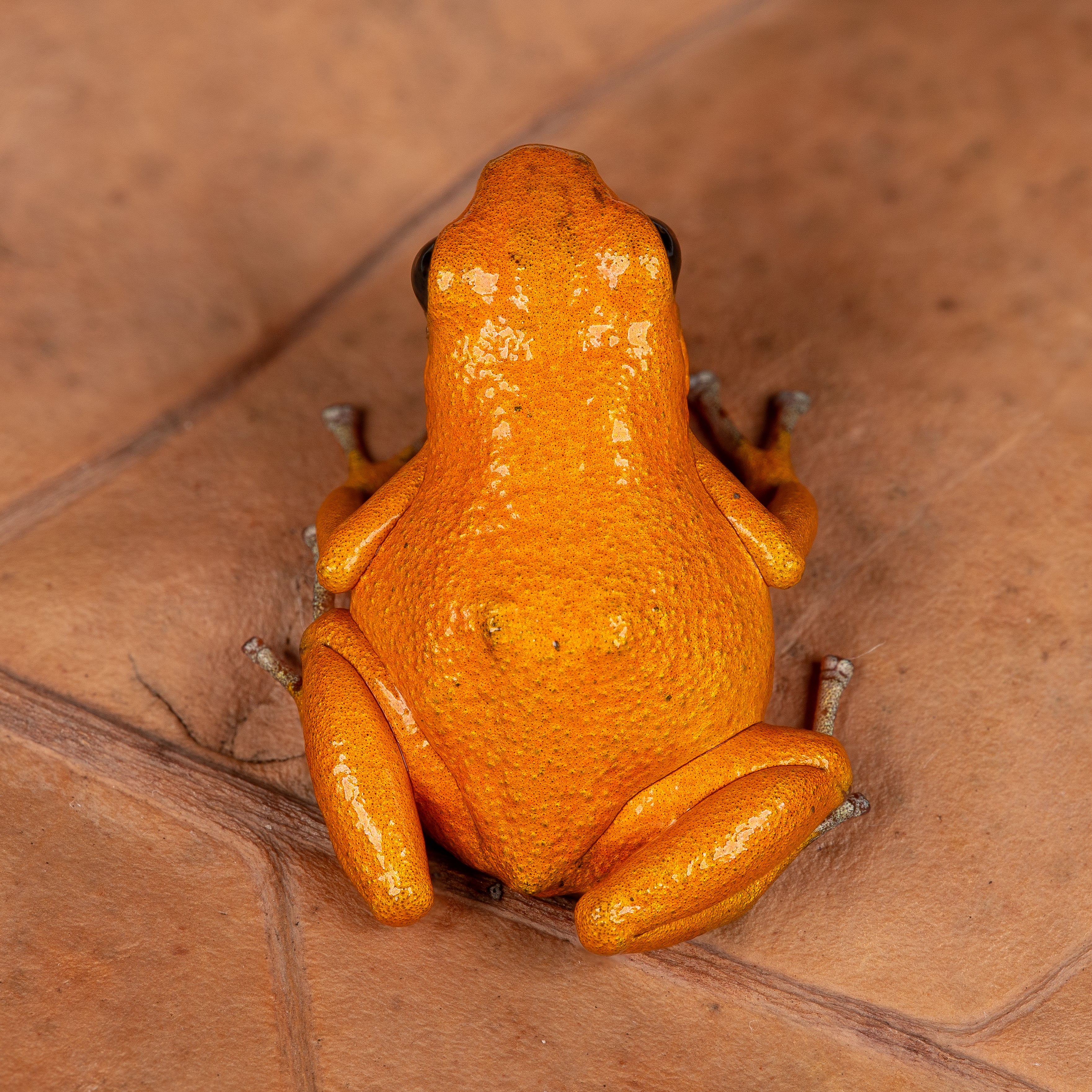 Oophaga pumilio "Solarte" are from Panama. They are usually bright orange in color. They do fine in small groups, but do best as a pair or trio when sexual maturity is reached. The males often have control of 1 to 5 square meters of territory in the wild, so rival males may display aggression for supremacy. They usually lay 3 to 10 eggs on glossy leaves, on glass, or sometimes in leaf litter. Tadpoles must be raised by adults because they feed on infertile eggs from the female. These dart frogs are interesting to many hobbyists because they exhibit biparental care. No more than a trio should go in a 20 gallon vertical conversion tank or a 18 x 24 Exo-terra enclosure. Additional information can be found, of course, through our complimentary Encyclopedia Database: DendroKnow Project.