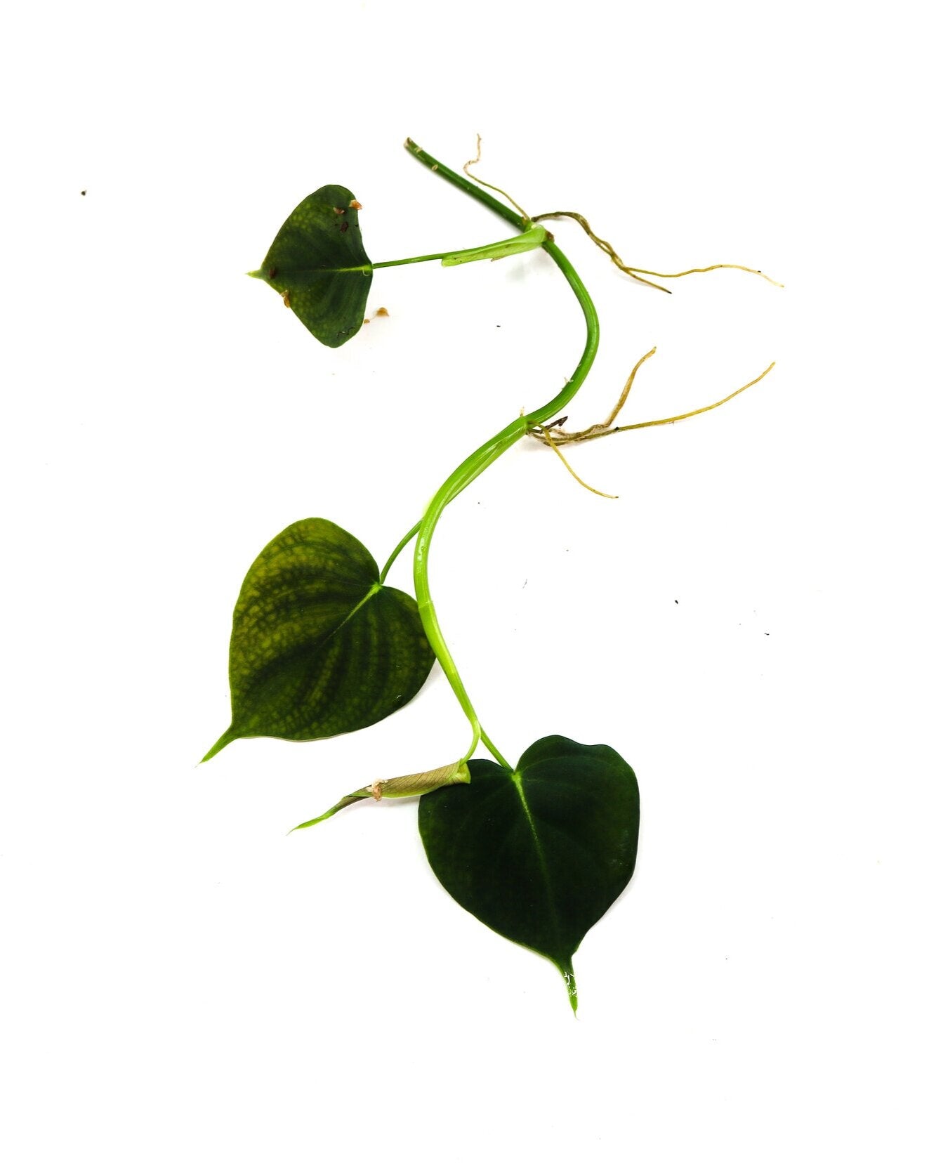 Philodendron cf. lupinum is a beautiful, whimsical climber with crimson undersides and velvety green topsides. It is native to northern Brazil. It is a truly remarkable species. Its mature foliage is a wonderful V-shape, but like most aroids, it usually does not obtain this form in vivaria. It is a moderate grower once established. It adheres very well to driftwood and backgrounds like most other Philodendron. It does well in moderate, indirect light and moderate to high humidity, and appreciates airflow. Moist sphagnum moss is helpful for rooting this species.