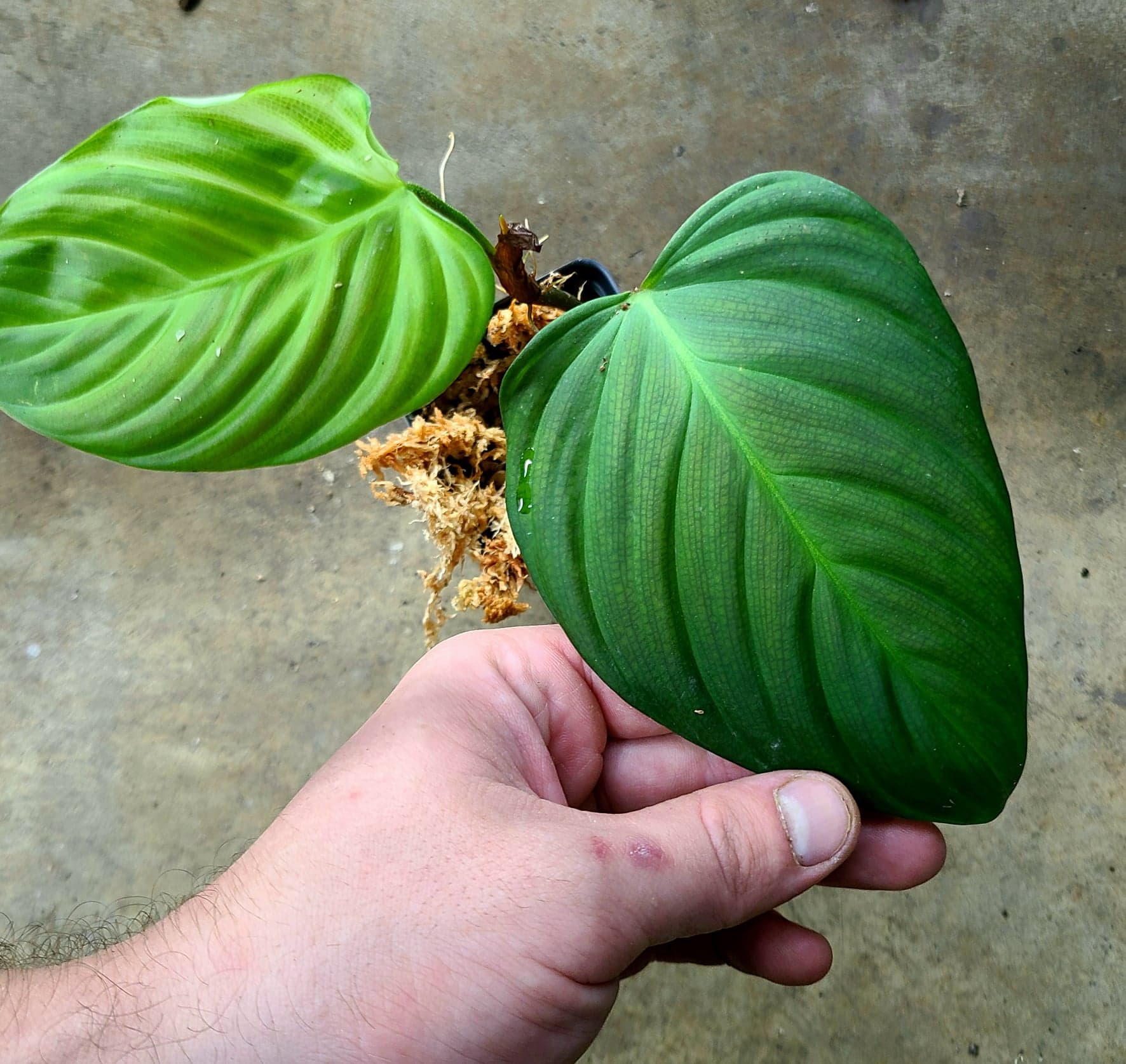 Philodendron sp. "Fuzzy Petiole" came in an import labeled verrucosum, but obviously isn’t. It is currently an unidentified species from Ecuador. It has amazing petioles that are covered in thick, fuzzy hairs, making this plant an extremely cool species to grow. Immature plants may not have pubescence. The leaves get around 6-8 inches for us, but can be smaller (as well as larger!). It does well in moderate, indirect light and moderate to high humidity, and appreciates airflow. Moist sphagnum moss is helpful for rooting this species.