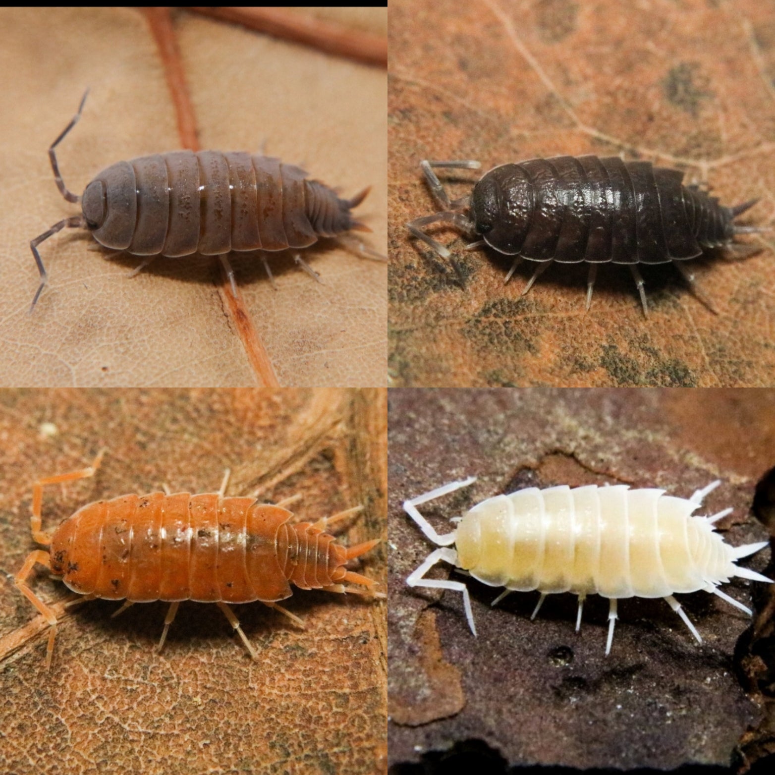 Porcellionides pruinosis are powder Isopods, and in this mix, you get them all for no extra cost! Picture is 4 types (floria, powder blue, powder orange, white out), but you may get others instead such as Oreo crumble, orange dalmatian, orange cream as well no longer carry Floria). They are great for bioactive enclosures, especially Crested Geckos and other tropical to temperate species. They are soft-bodied and are great feeders. They are native to the USA and Mexico. Our isopods are fed Iso-licious Isopod Food 1-2x a week, including our new wet mixes, supplemented with potatoes, squash, carrots, our leaf powder, and a cuttlebone. These isopods enjoy warm temperatures and an occasional misting, but do not do as well in an extremely wet environment. We allow space for a moderate moisture gradient, starting with one side of the enclosure having wet NZ sphagnum moss, the middle being moist and mostly covered with leaf litter and bark, and onto the opposite side being completely dry and covered only with leaf litter. This provides the needed space for Isopods to osmoregulate to remain in homeostasis.