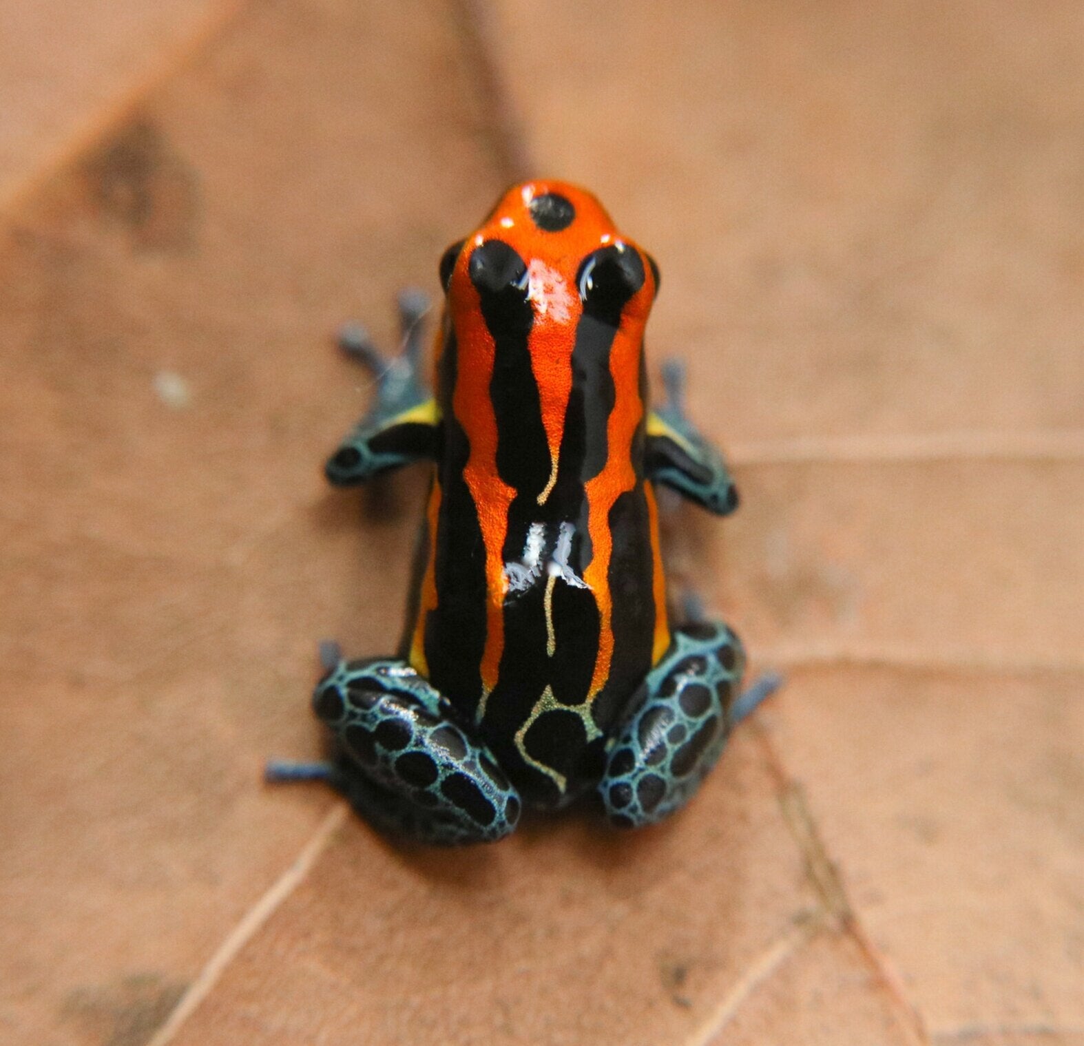 Ranitomeya amazonica, is a lowland species, inhabiting the Amazonian Drainage Basin in Peru, near Iquitos. The Red population was imported by Mark Pepper of Understory Enterprises. This population is from a small blackwater tributary of the Rio Tigre (George Gazones). They do well in groups, and have very limited issues with aggression. R. amazonica usually lay 4 to 12 eggs underwater in film canisters or bromeliads, but sometimes eggs can be found in leaf litter or vegetation. Tadpoles can be pulled or left to be raised by adults, but may cannibalize if left with other tadpoles in proximity with less-than-adequate food. Minor egg eating may occur from rival females, but often groups display minimal to no aggression. No more than a trio should go in a 10 gallon vertical conversion tank or a 12 x 12 x 18 ExoTerra tank, and we advise larger enclosures to prevent escapees. Please contact us with further questions.