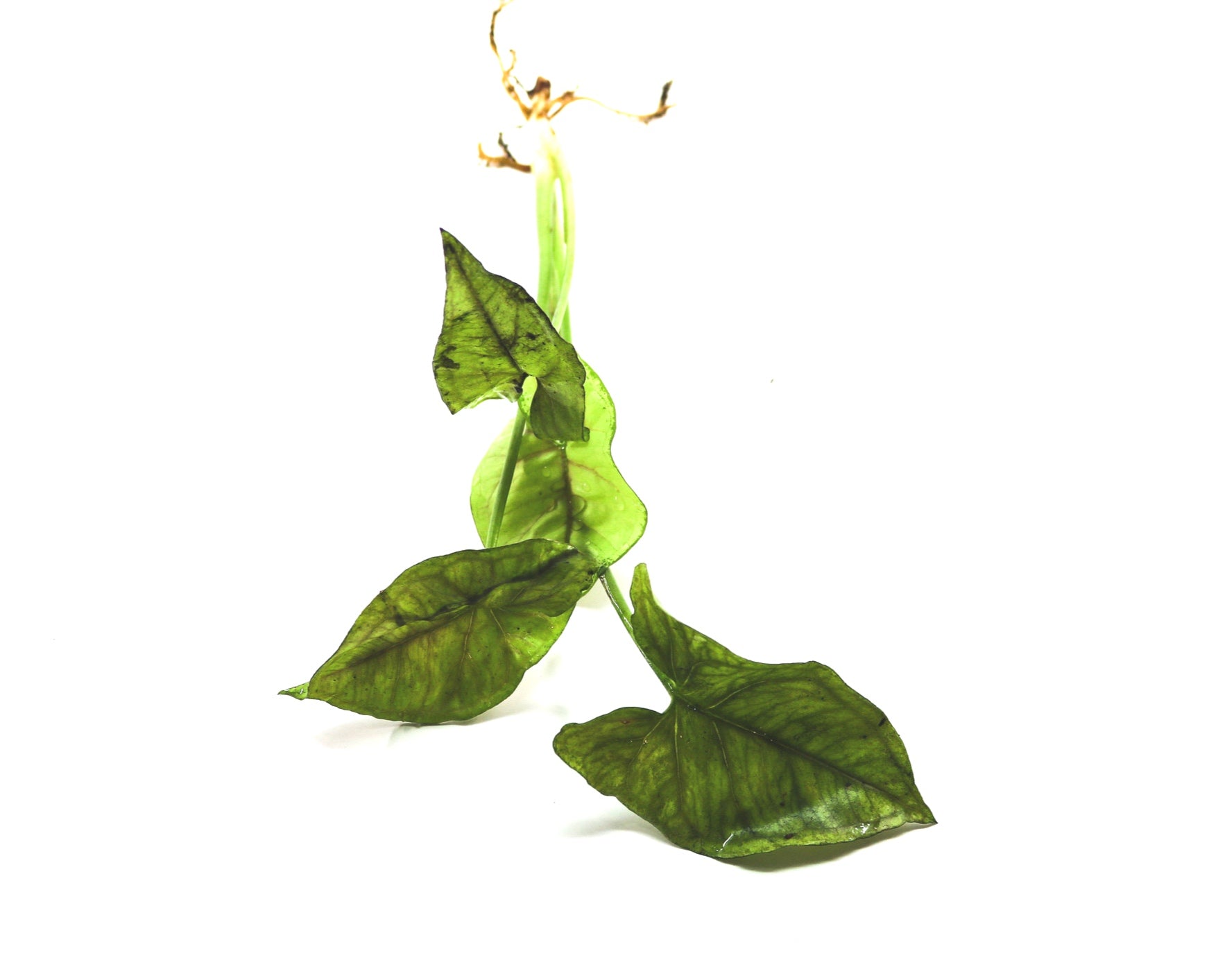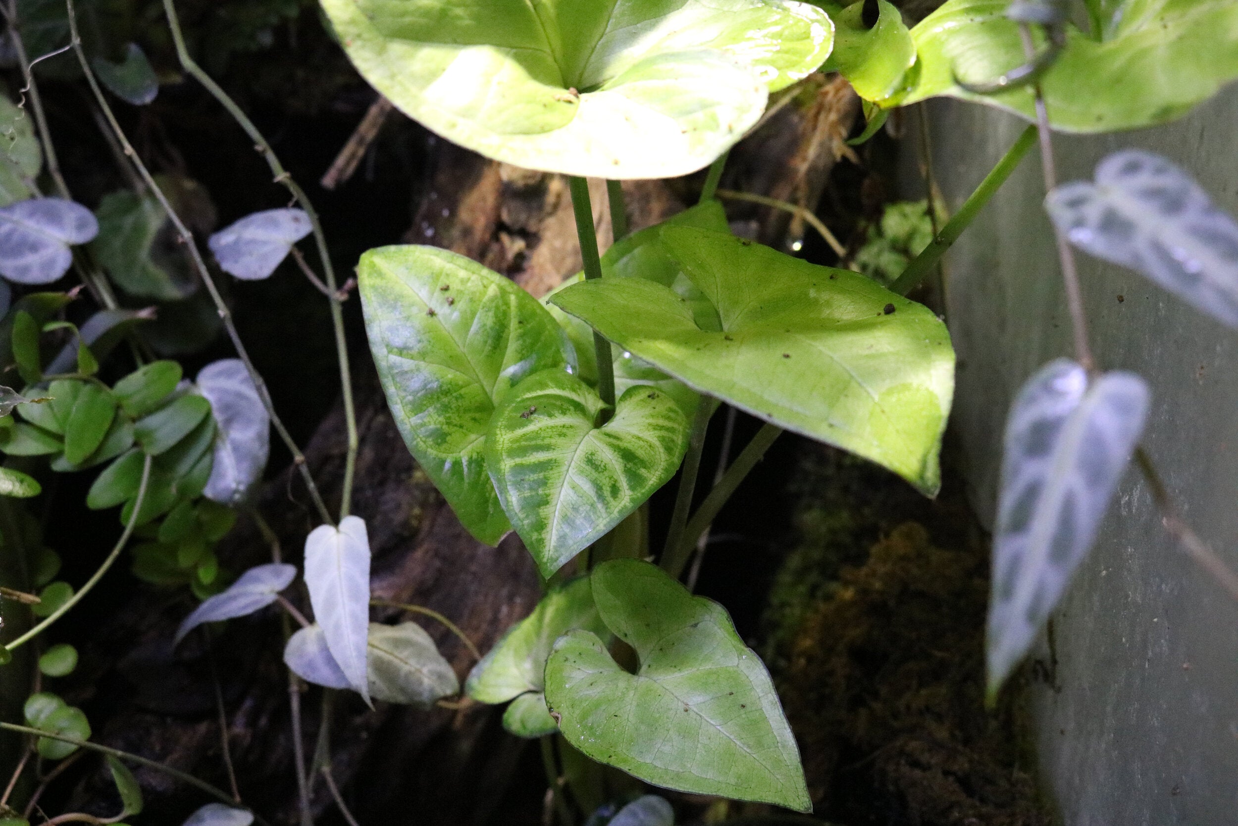 Syngonium podophyllum is a classic arrowhead vine that has many different cultivars. The cultivar FrogDaddy offers has light green leaves with a darker venation and has a green to peach-pink frilled rim. It is very popular amongst vivarium enthusiasts and has a bunching habit. It does well in bright, indirect light and moderate to high humidity, but appreciates airflow. Moist soil and sphagnum moss are helpful for rooting this species. This species can grow to be quite large, but can easily be pruned, and is hemiepiphytic in nature.