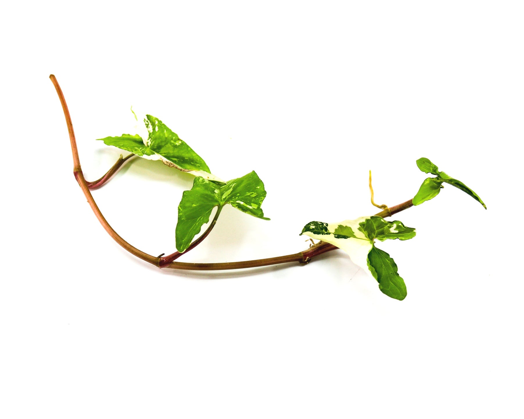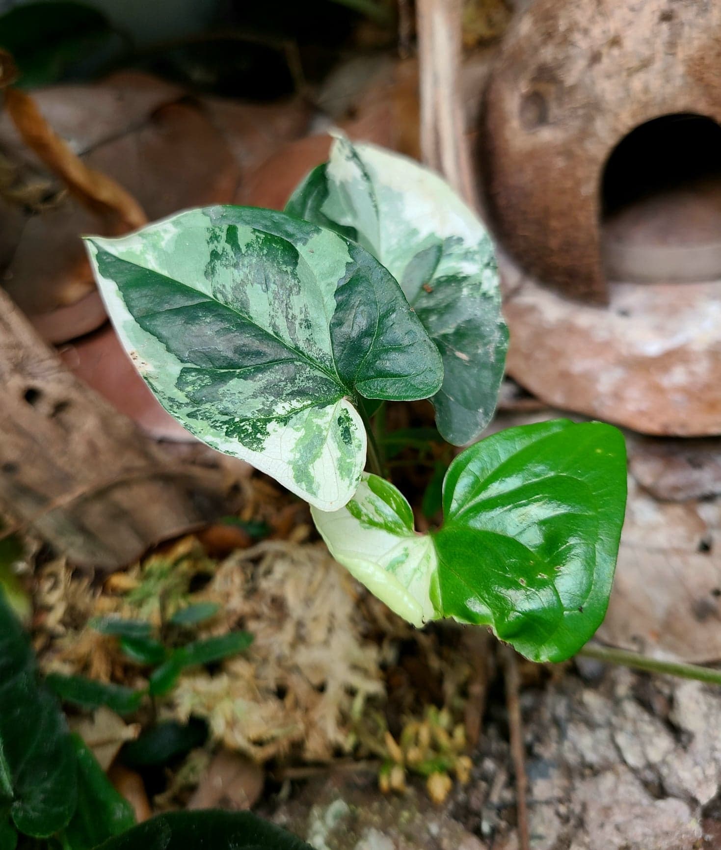 Syngonium podophyllum "Albo-variegata" is a spin on the classic arrowhead vine in that it is variegated! It has amazing green and white speckled contrast, and is prized amongst Syngonium collectors. It is very popular amongst vivarium enthusiasts and has a bunching habit. It does well in bright, indirect light and moderate to high humidity, but appreciates airflow. Moist soil and sphagnum moss are helpful for rooting this species. This species can grow to be quite large, but can easily be pruned, and is hemiepiphytic in nature.
